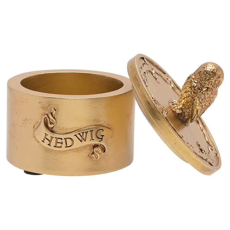 Este fascinante cofre está adornado con la Búho Hedwig y rebosante de magia de Hogwarts. Este cofre decorativo de resina luce un acabado dorado con efecto metálico, con un estandarte de "Hedwig" en relieve y un molde 3D en la tapa.