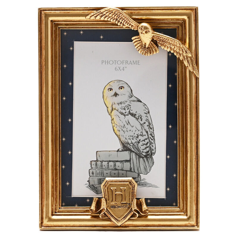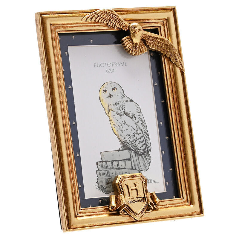 El marco de fotos vertical de resina dorada presenta un acabado con efecto metálico, con adornos 3D de Hedwig y el escudo de Hogwarts. Está diseñado para exhibirse con el soporte incorporado.