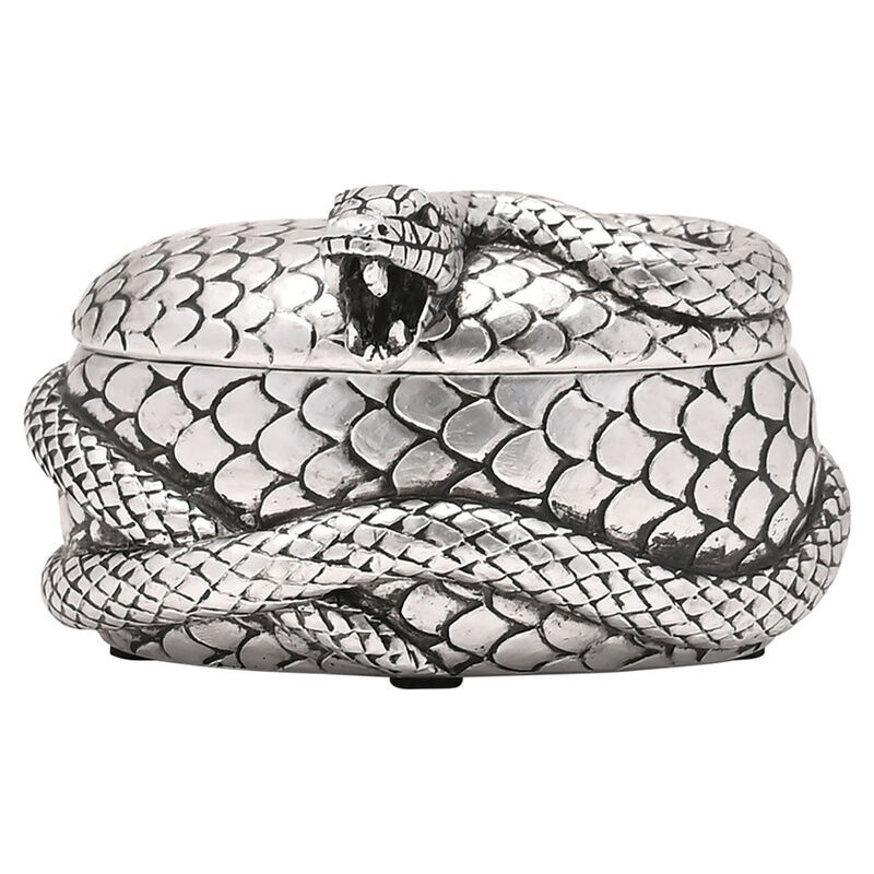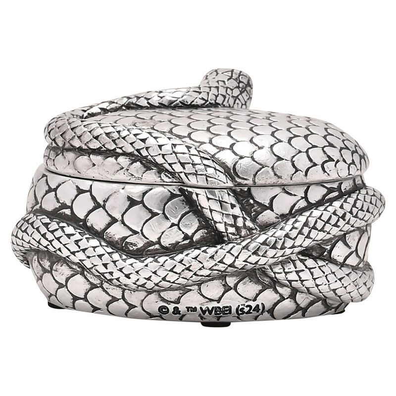 El diseño presenta a Nagini, la formidable serpiente de Lord Voldemort, elegantemente envuelta alrededor de la caja plateada.