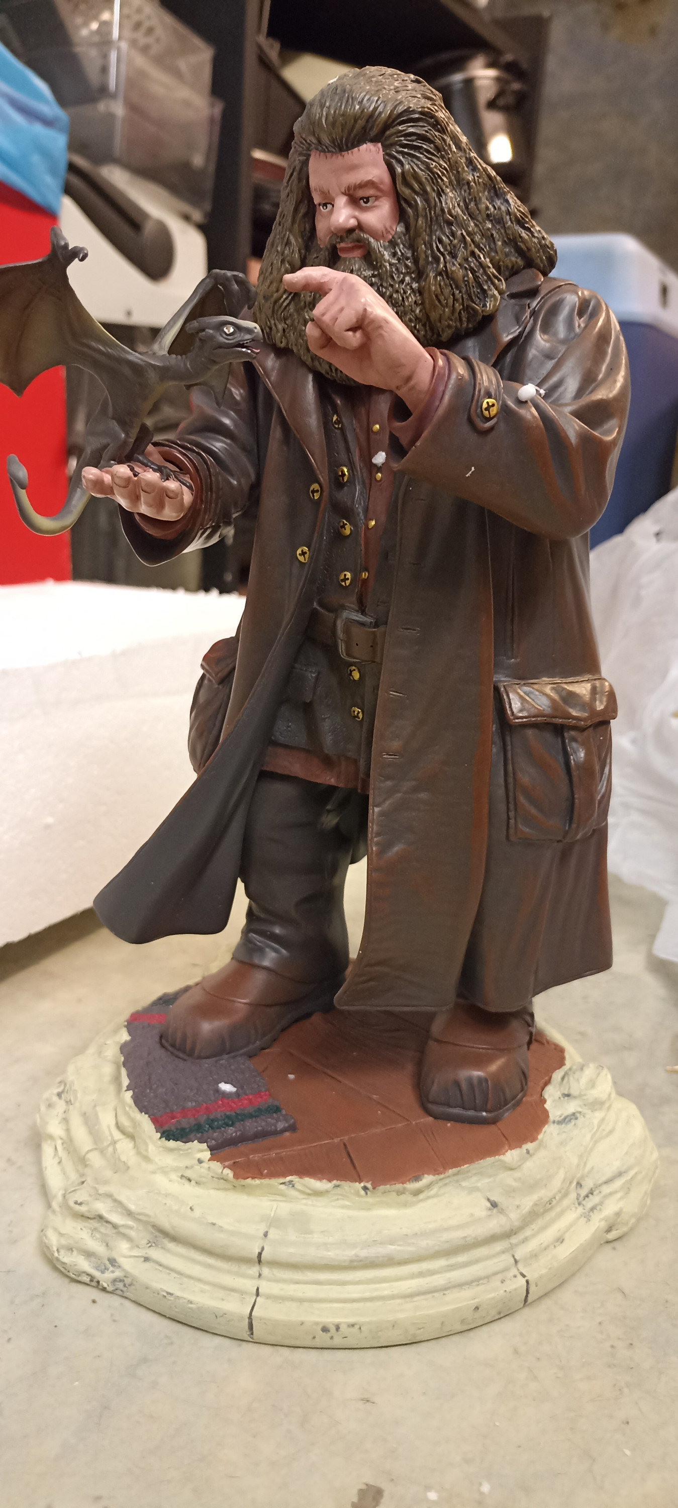 Magnifique figurine (photo 1) Le must c'est la main portant le dragonnet Norbert emballée à part dans l'emballage protecteur et qu'on insère facilement dans le bras de Hagrid car aimantée (pratique aussi quand on doit le nettoyer (photo 2) Le point négatif (d'où ma note de 4/5) est qu'il y avait un trou dans le manteau de Hagrid (photo 3) dû à mon avis à la manipulation lors de l'emballage chez le fabricant ou chez CadeauCity car je n'ai pas trouvé le morceau trouvé à l'intérieur du paquet. Je voulais faire une réclamation mais finalement ne l'ai pas faite à cause du très long délai pour enfin pouvoir l'acheter, dû à des ruptures de stock et ensuite plusieurs mois d'attente suite à ma commande (presque 1 an dans mon cas) Comme ce trou est situé dans le dos de la figurine, il ne se voit que si on la tourne mais je suis quand même un poil déçue, au vu du prix et de l'attente d'avoir reçu une figurine abîmée. Avis au Service Client : ce serait bien que les personnes qui contrôlent les objets avant de leur attacher l'étiquette autour du cou et de les emballer se donnent quelques minutes pour vérifier ce genre de choses car je l'ai vue en 30 secondes chrono (bien visible)