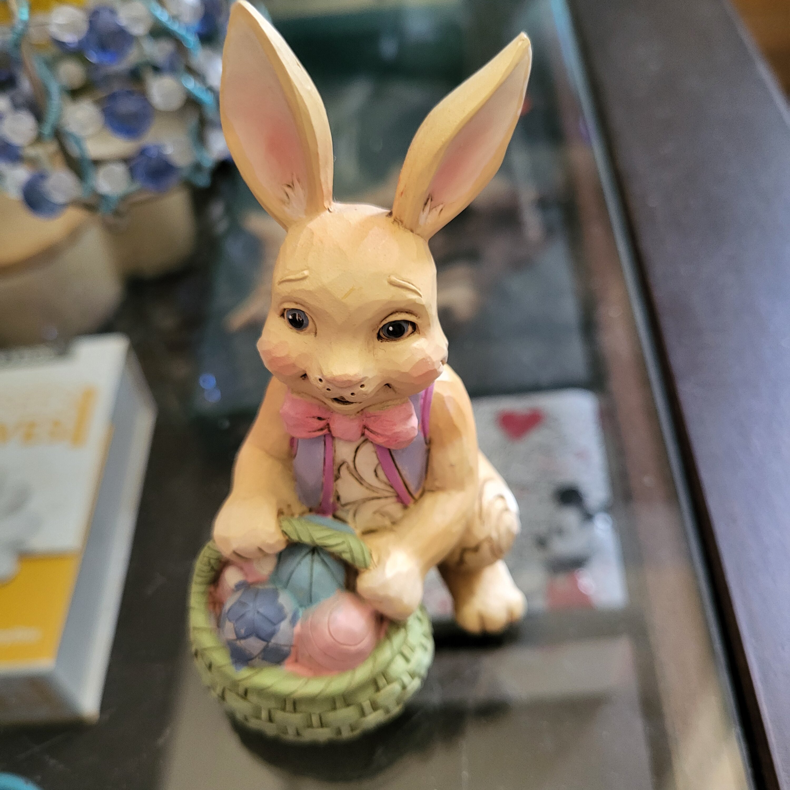 Mini Figurine of a rabbit dressed in a bow and a brightly colored vest, collecting Easter eggs in his basket. Figure from the Heartwood Creek collection, designed by award-winning artist and sculptor Jim Shore. Each figurine is hand painted and slight color variations are expected, making each piece unique. Packaged in a gift box. These items are not children's toys. Intended for adults.