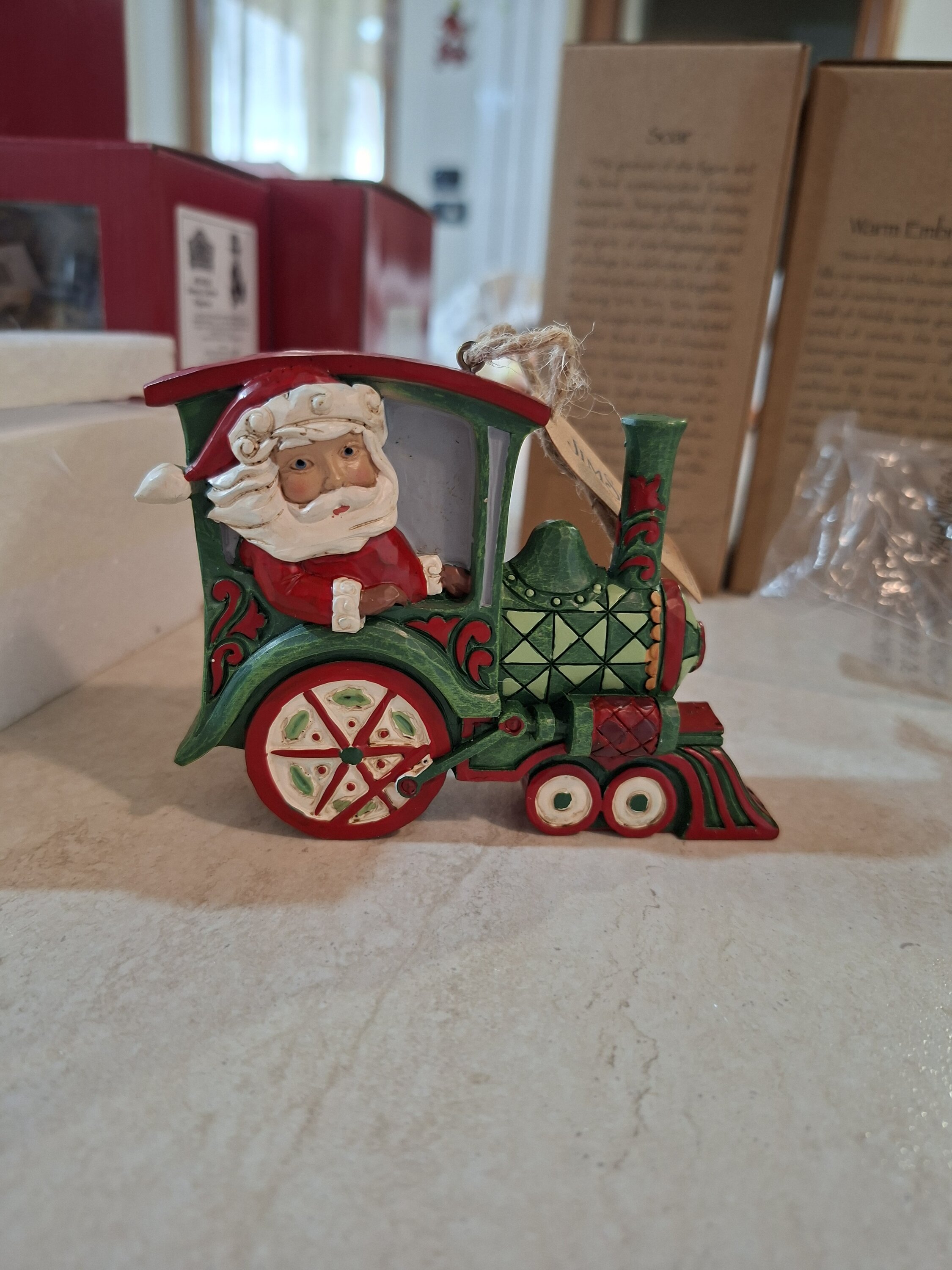 ¡Todos a bordo del tren de Navidad , próxima parada, recuerdos de holiday ! Papá Noel conduce esta fantástica locomotora de Rosemaling roja y verde con ruedas impulsadas por muérdago. Cuelga este elegante tren en tu árbol y admira la artesanía creativa de Jim Shore.