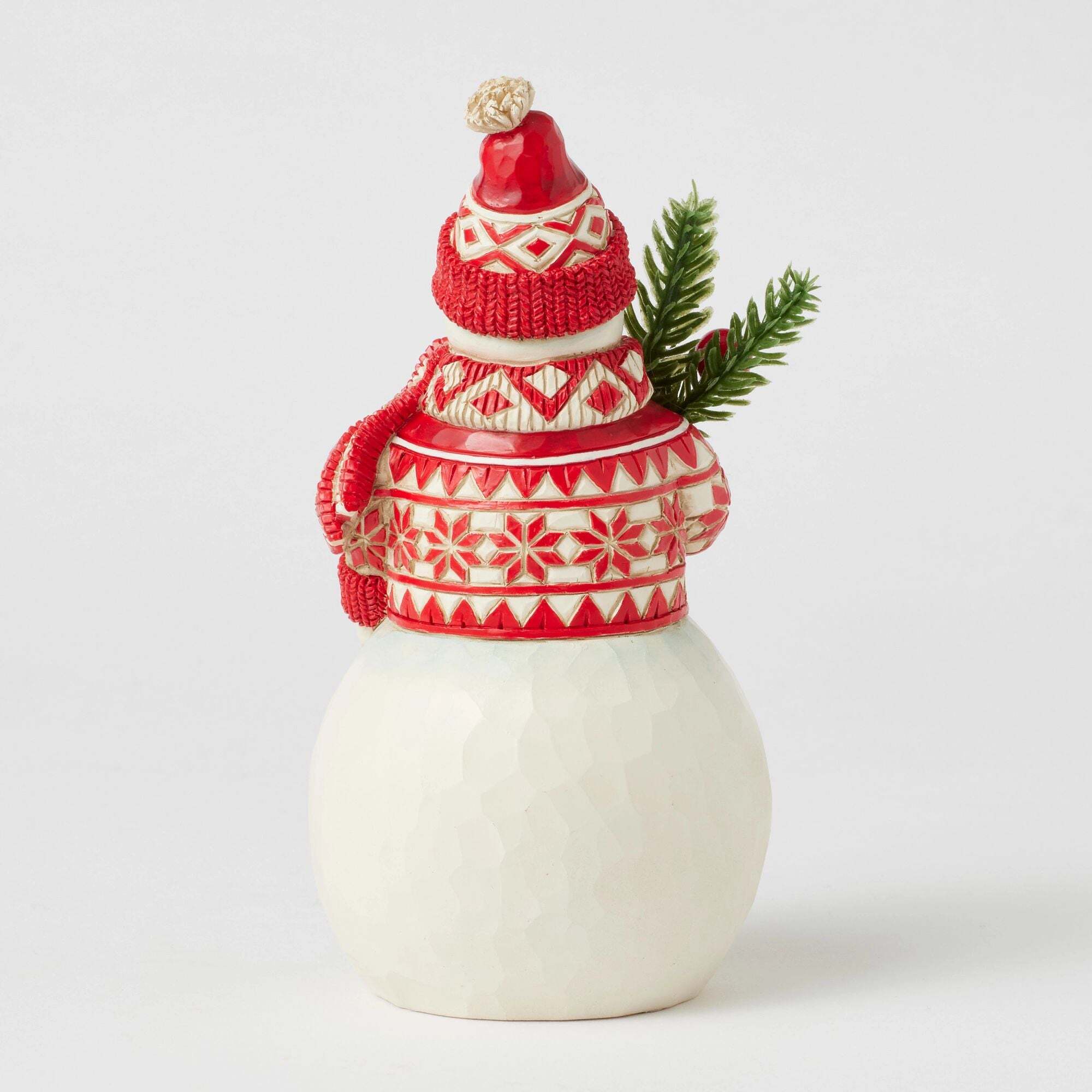 Este feliz muñeco de nieve nórdico, vestido con suéter, bufanda y gorro, irradia un espíritu Navidad . Con una amplia sonrisa, sostiene una rama de abeto fresca y una piña en sus manos.