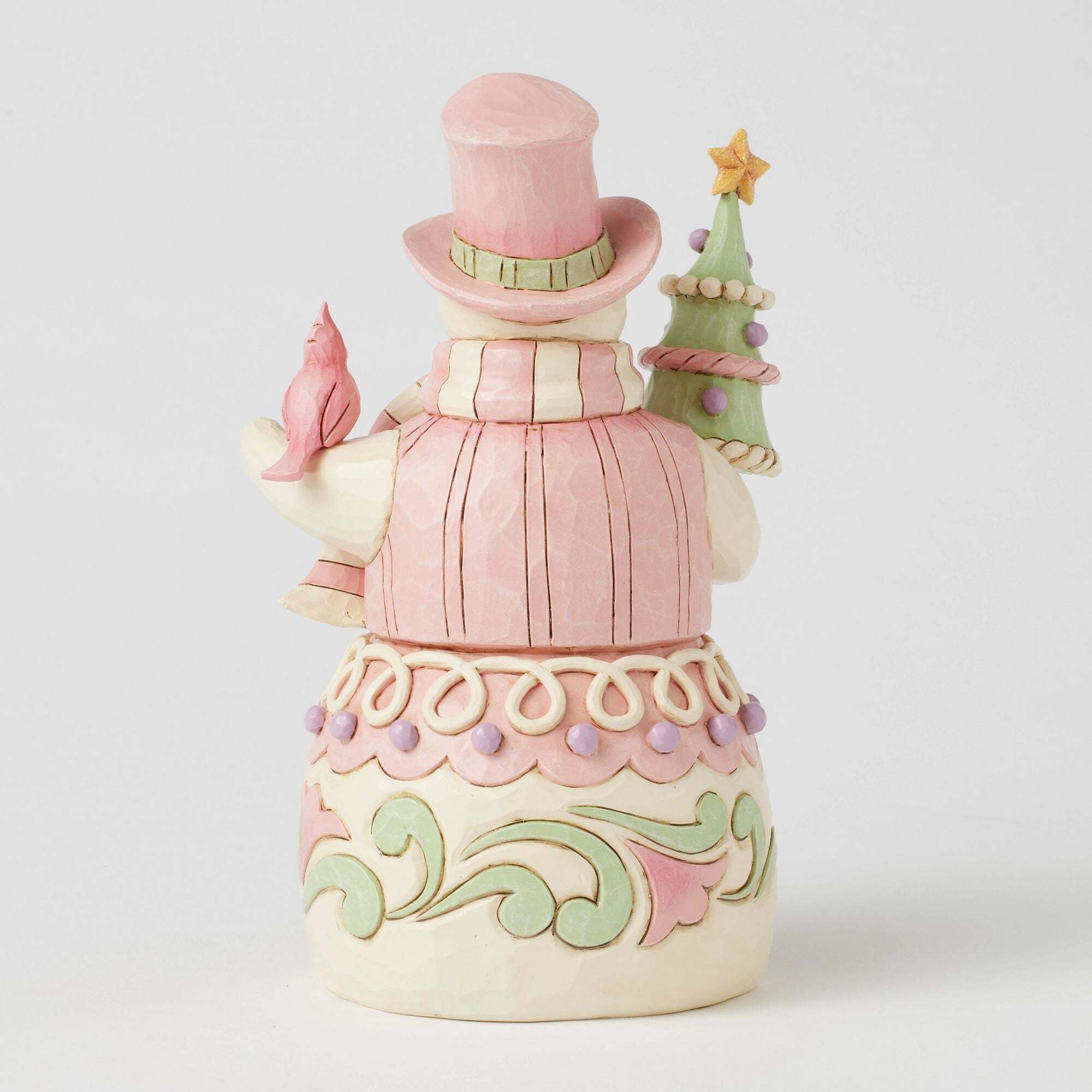 Este muñeco de nieve rosa pastel de la colección Heartwood Sweets, diseñado por Jim Shore, rebosa encanto con sus delicados estampados, purpurina y detalles que reflejan el espíritu navideño. Sostiene con cariño un árbol decorado y un cardenal.