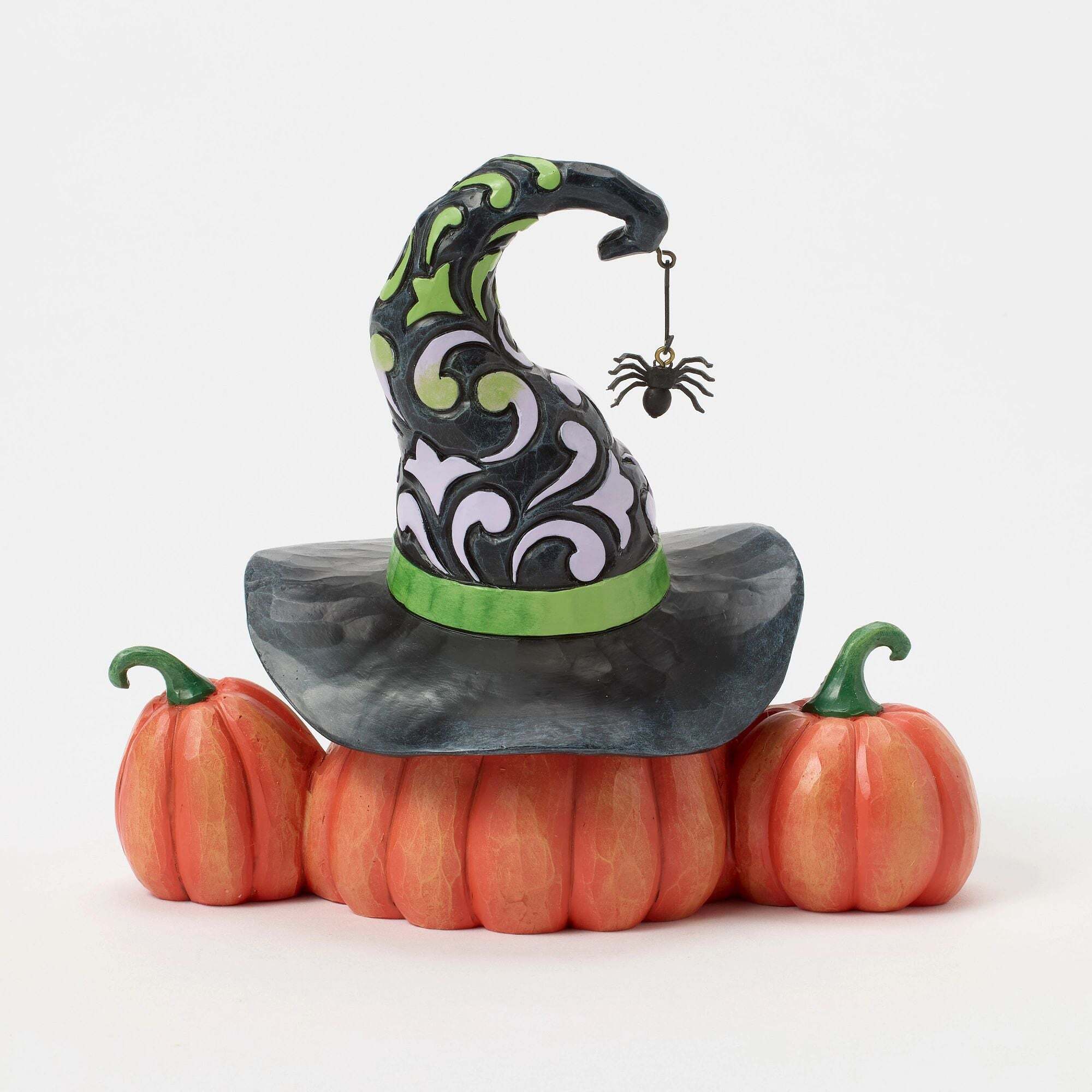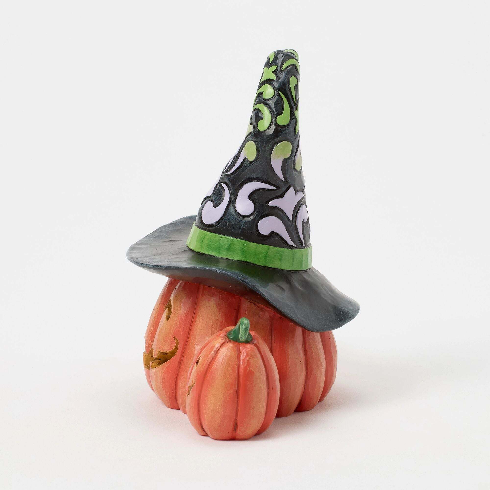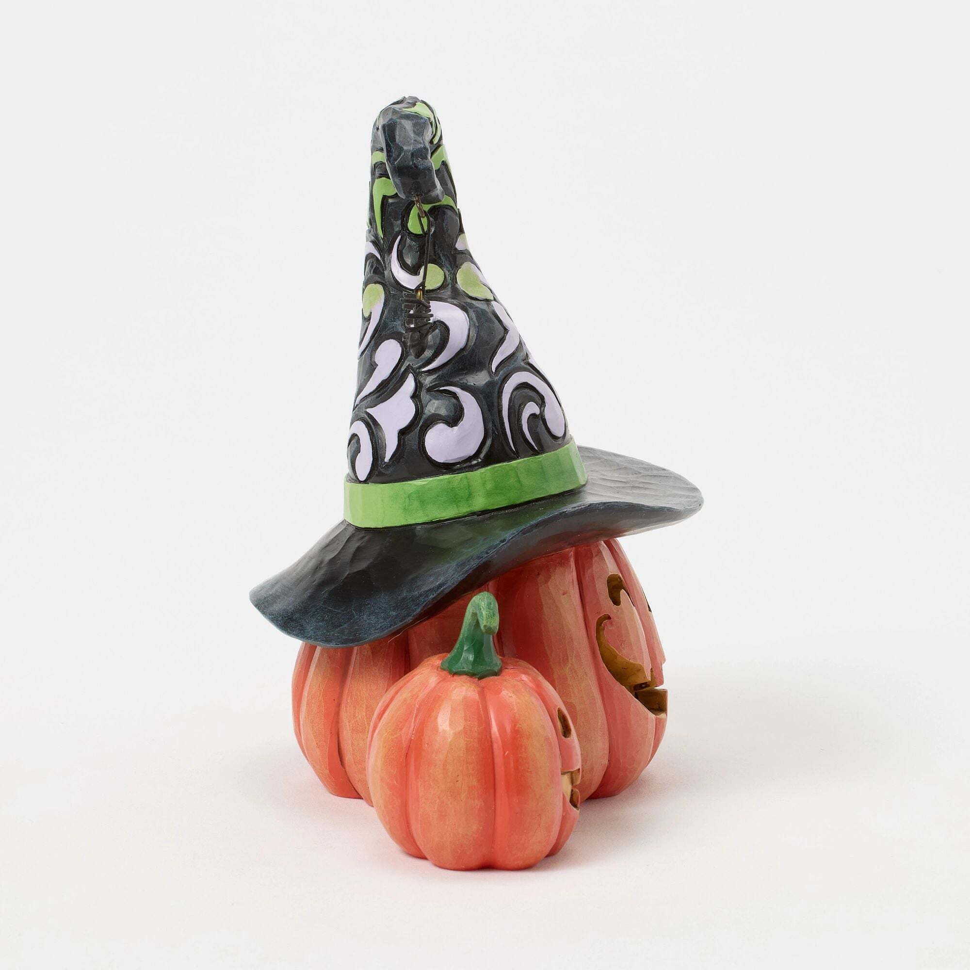 Sumérgete en el espíritu de Halloween con estas encantadoras figuras de Jim Shore, que incluyen tres calabazas sonrientes. La más grande, en el centro, ¡lleva un sombrero de bruja que se ilumina! Este trío crea un ambiente festivo y misterioso a la vez.