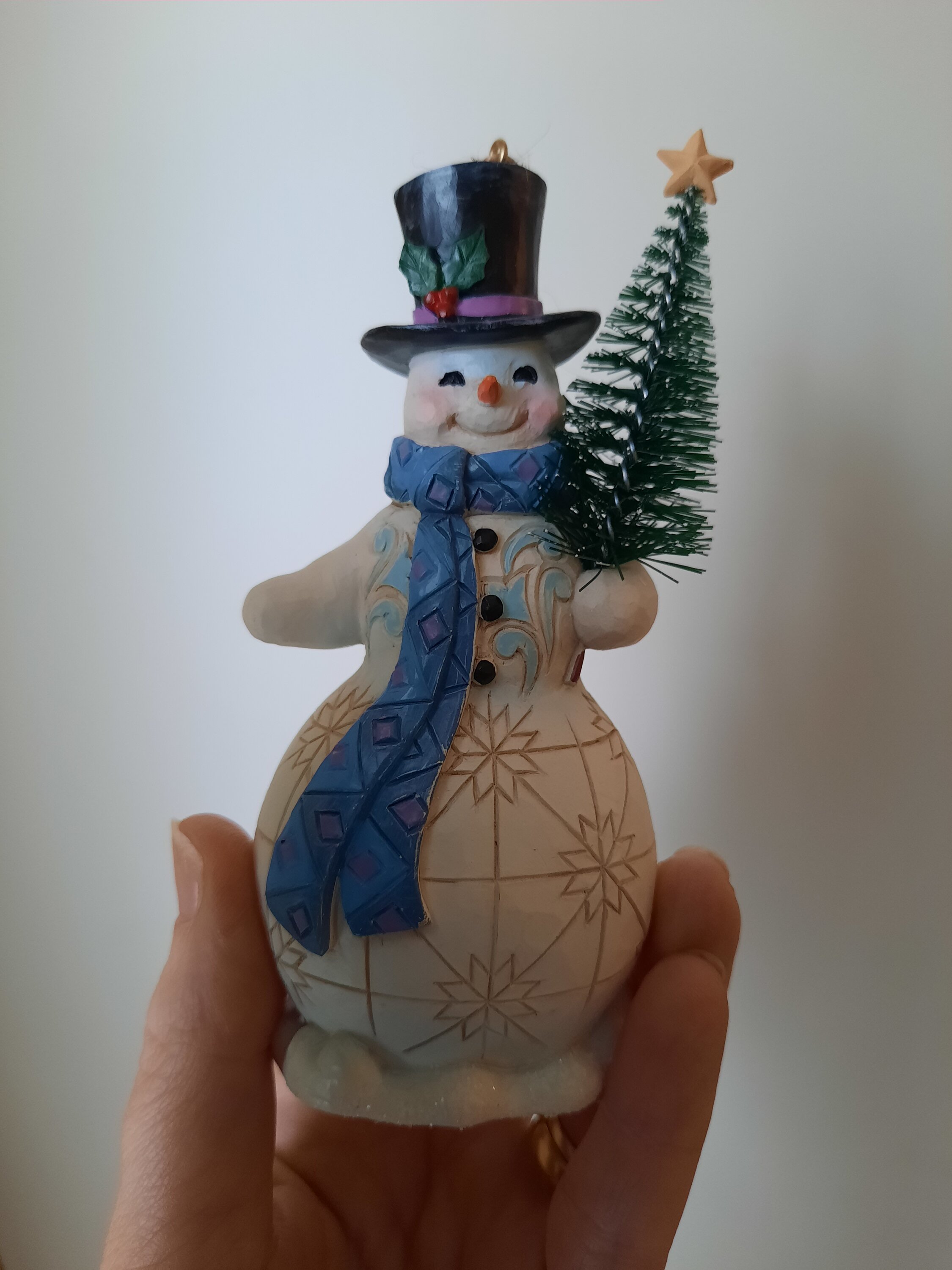 Este muñeco de nieve es sencillamente adorable. Con una elaboración impecable, una carita encantadora y un detalle de árbol de Navidad muy realista, sin duda es una pieza perfecta para tu colección. De excelente calidad, no te decepcionará. Mide aproximadamente 12,5 cm de alto y tiene nieve brillante en la base.