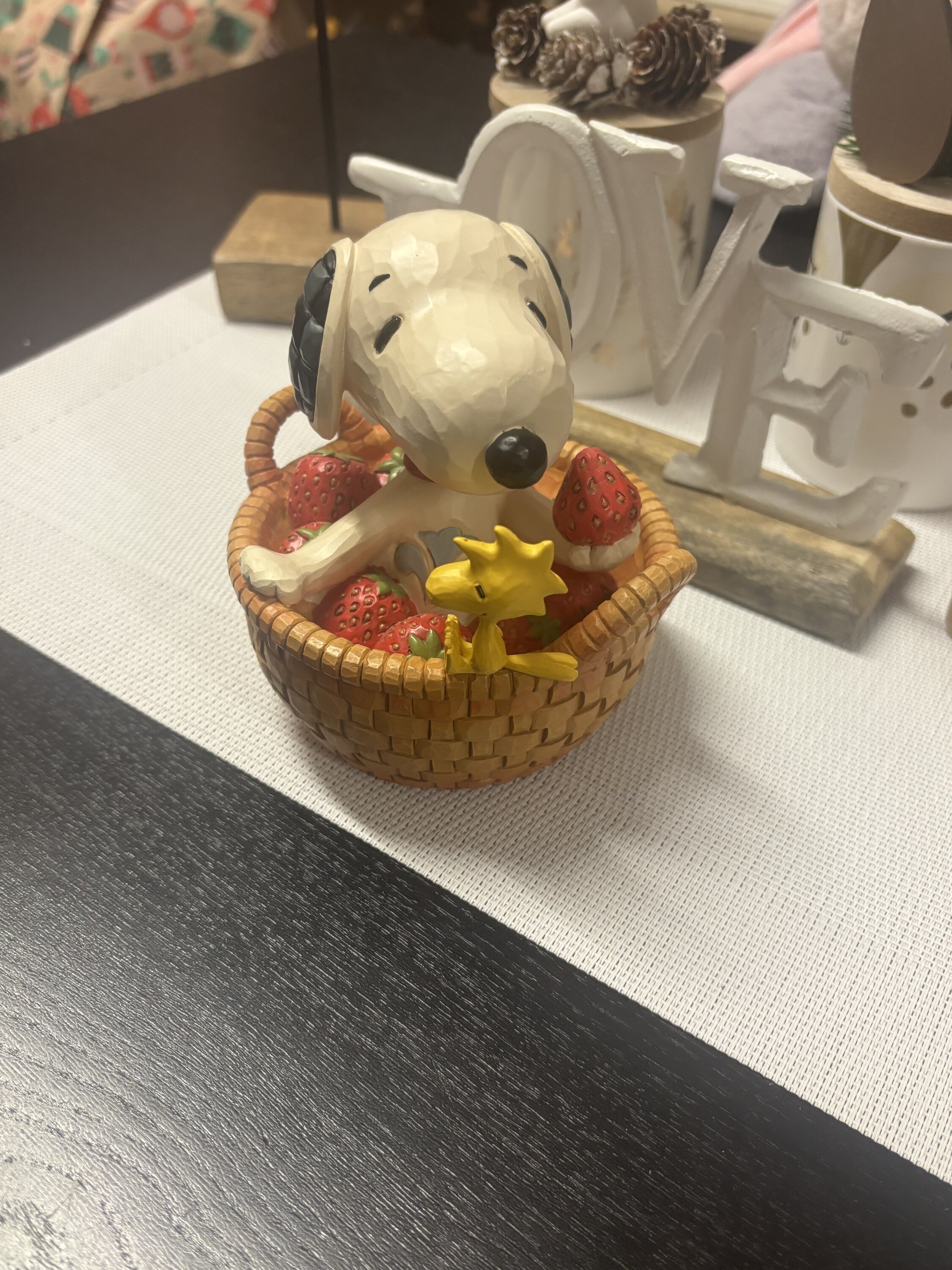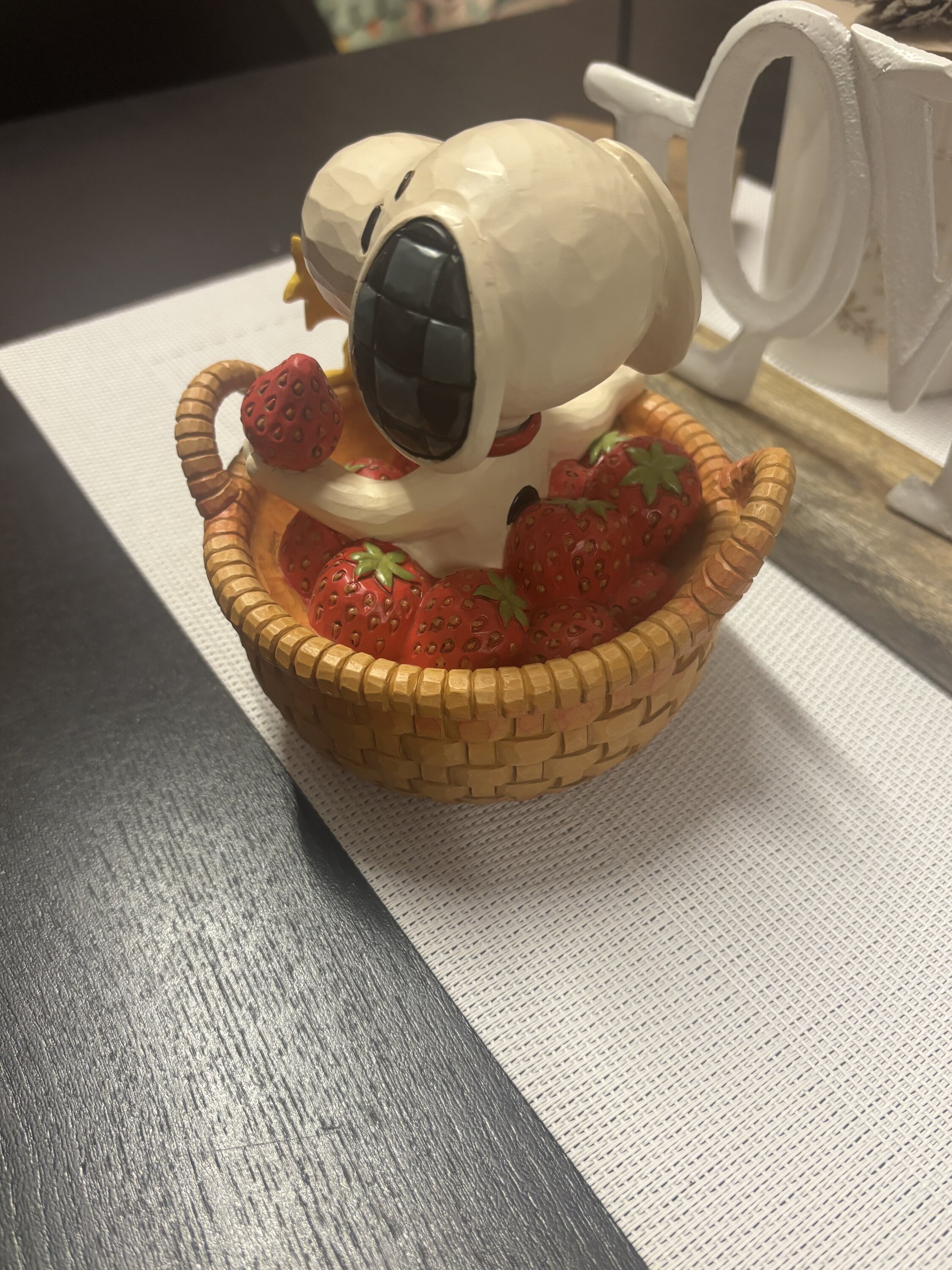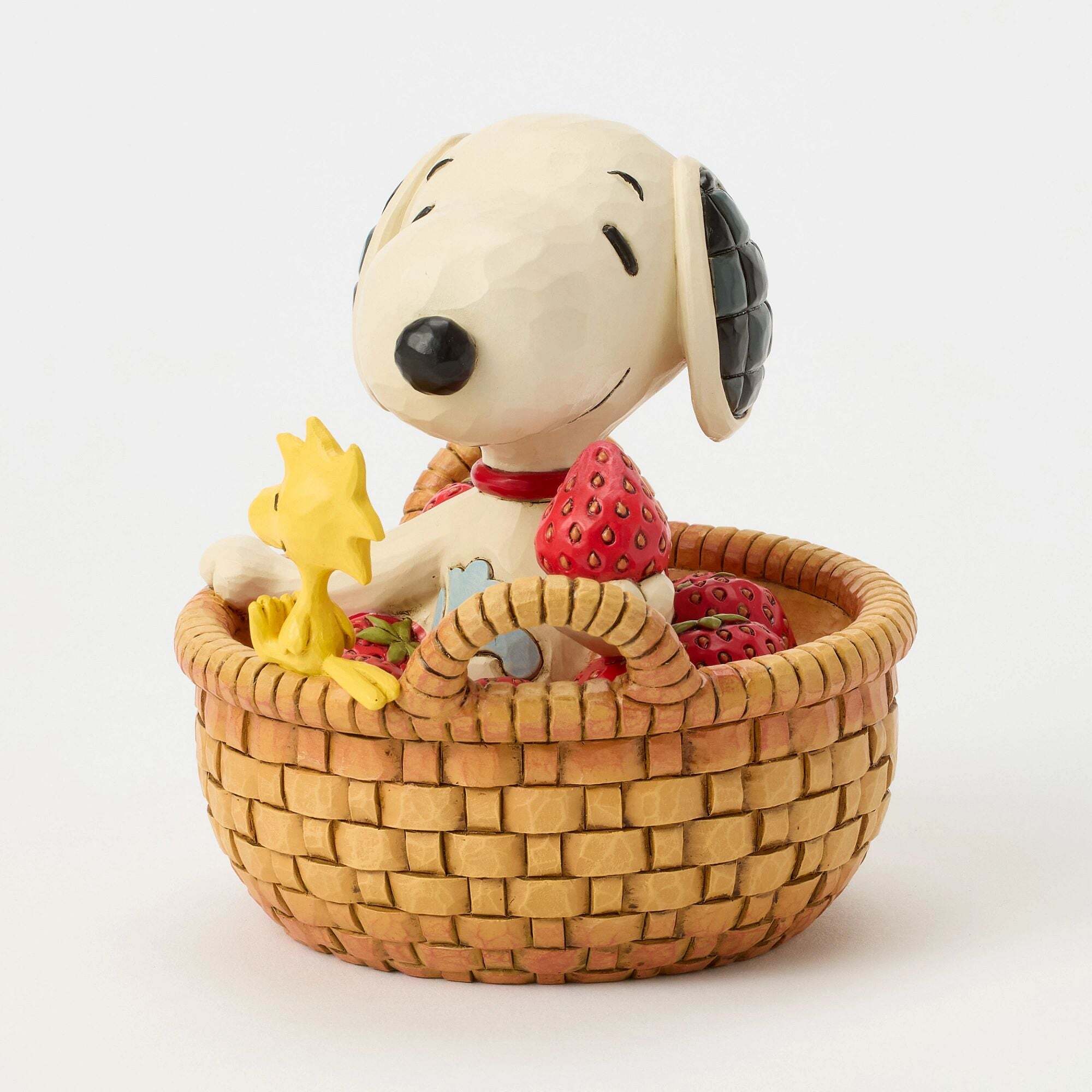 Snoopy y Woodstock rebosan de felicidad en esta tierna figura. Acurrucados en una cesta de fresas recién recogidas, celebran juntos la dulzura de la primavera. Todo realzado por la artesanía característica de Jim Shore, sus vibrantes colores y su encanto natural. Estas figuras no son juguetes para niños. Destinadas solo para adultos. Altura: 12,5 cm.