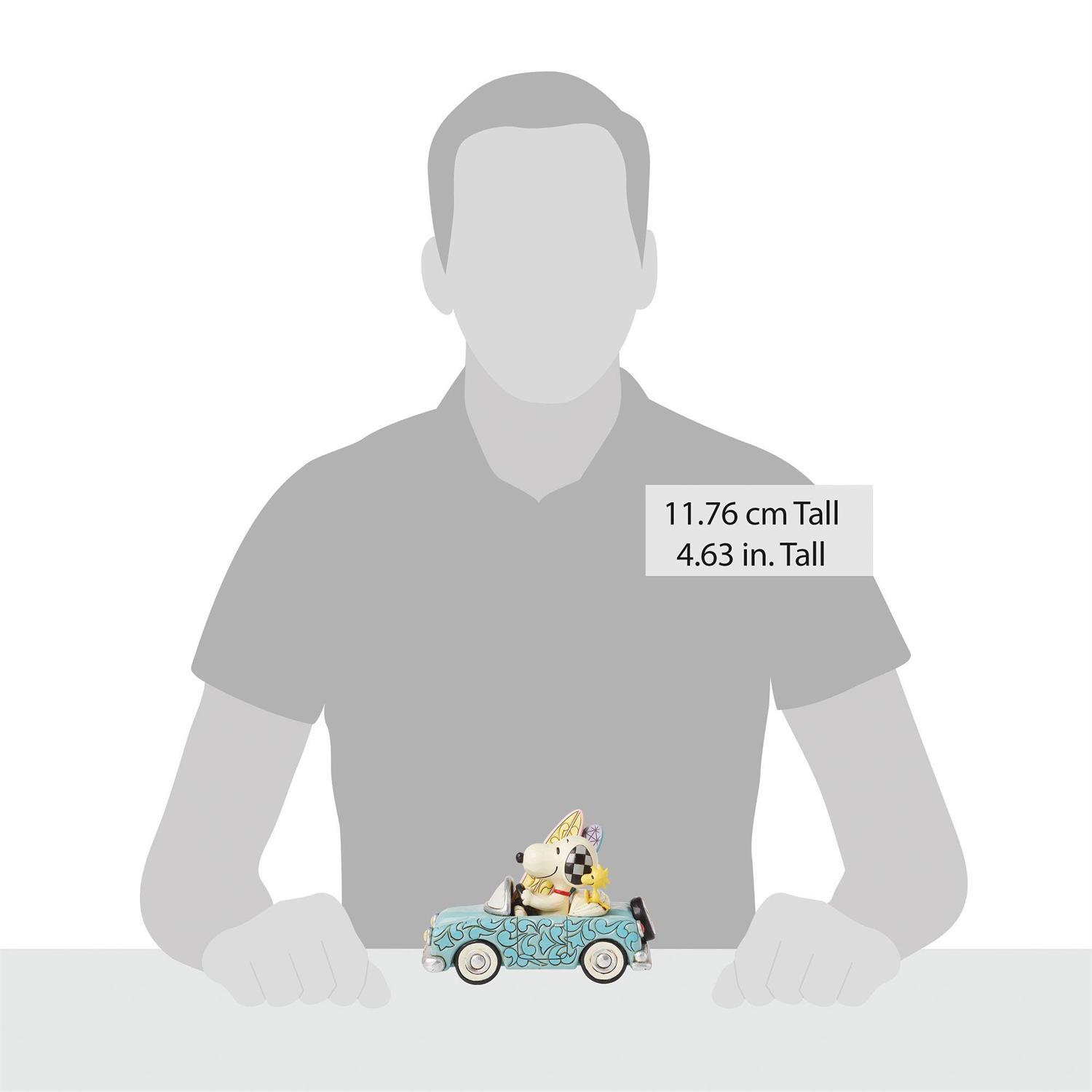 Snoopy tiene el volante en esta encantadora creación de Jim Shore, él y Woodstock se dirigen a la playa en un llamativo convertible lleno de tablas de surf. La pareja se prepara para surfear en el elegante coche, decorado con encantadores detalles de rosemaling.