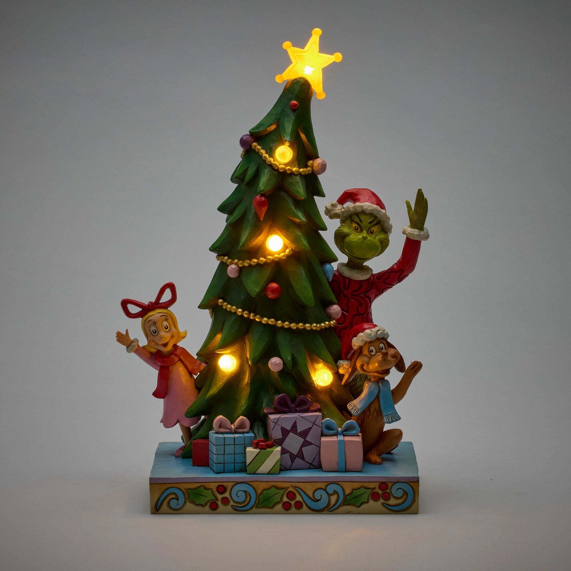 ¡Hola desde VillaQuién! El Grinch, Max y Cindy-Lou Quien saludan feliz desde detrás de un brillante árbol de Navidad adornado con luces LED reales. Rebosante de color y con el encanto característico de Jim Shore, esta pieza aporta un toque de alegría y travesuras a este clásico holiday . Estas figuras no son juguetes para niños. Destinadas solo para adultos. Altura: 26,5 cm.