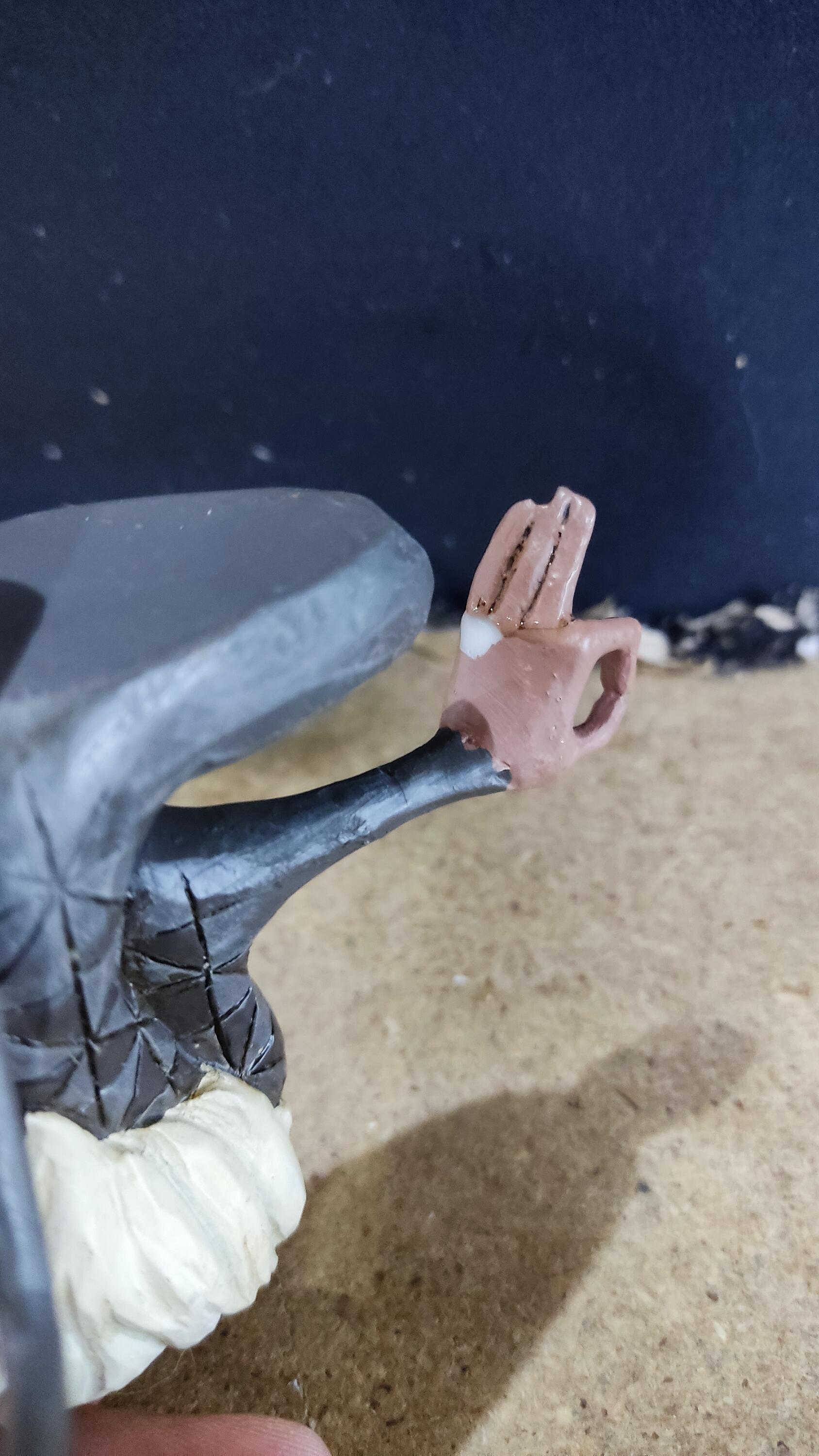 Defectos observados: Roturas reparadas en los dedos de la mano izquierda (re-pegadas).