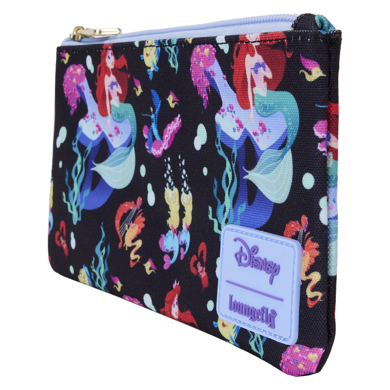 El Loungefly Disney La Sirenita 35.º aniversario La cartera tipo pulsera de nailon con estampado integral “Life is the Bubbles” está hecha de nailon. Cremalleras de cartera cerradas con herrajes de metal dorado. Las características adicionales incluyen detalles impresos. Toma nota del forro interior a juego.