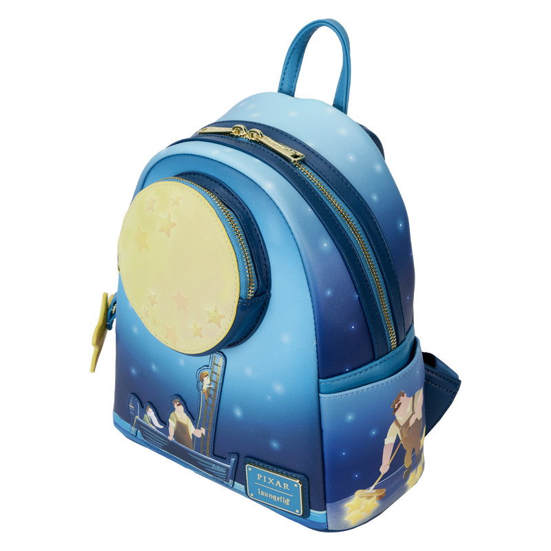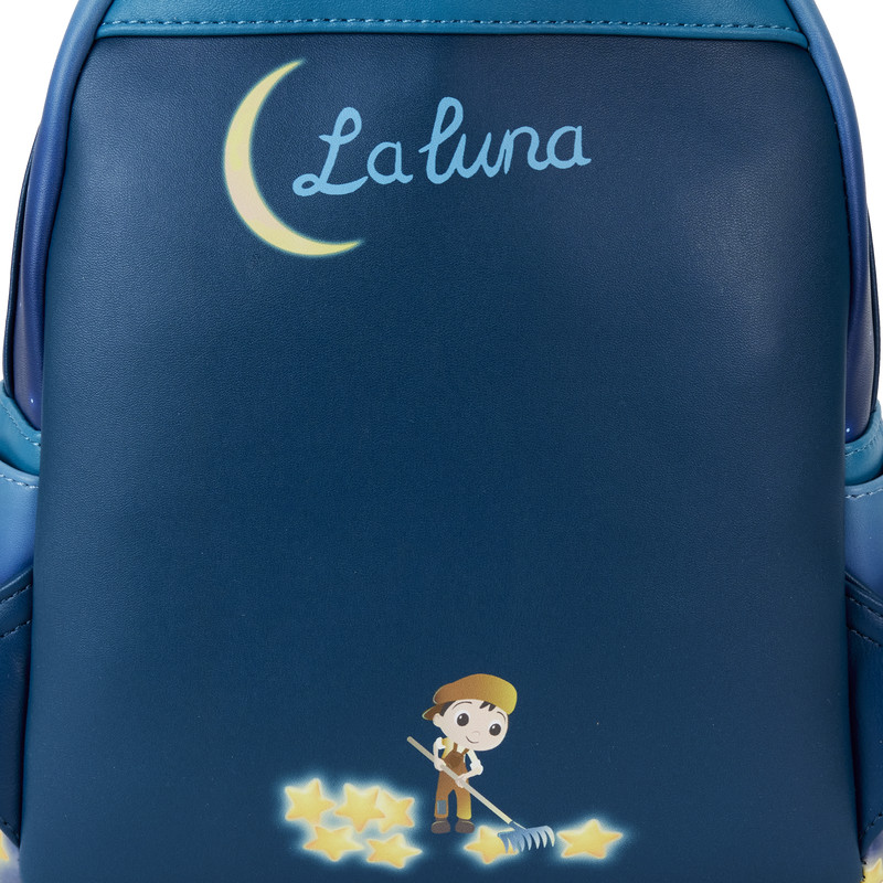 ¡Encuentra tu lugar entre las estrellas con la Mini Mochila Loungefly Disney-Pixar La Luna Glow! En la parte delantera, un gran bolsillo con cremallera en forma de luna cuelga en un cielo estrellado.