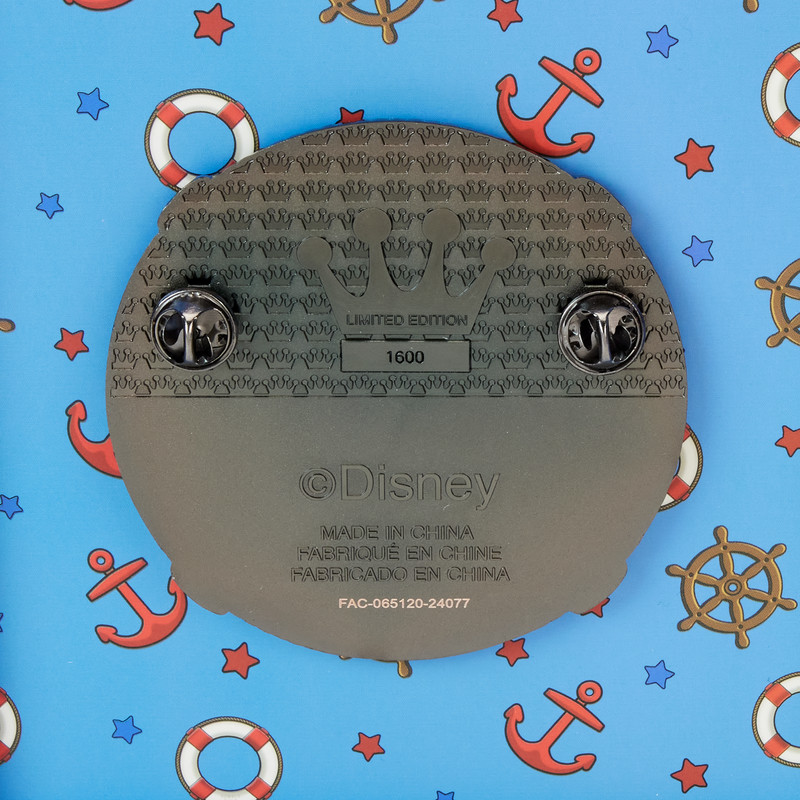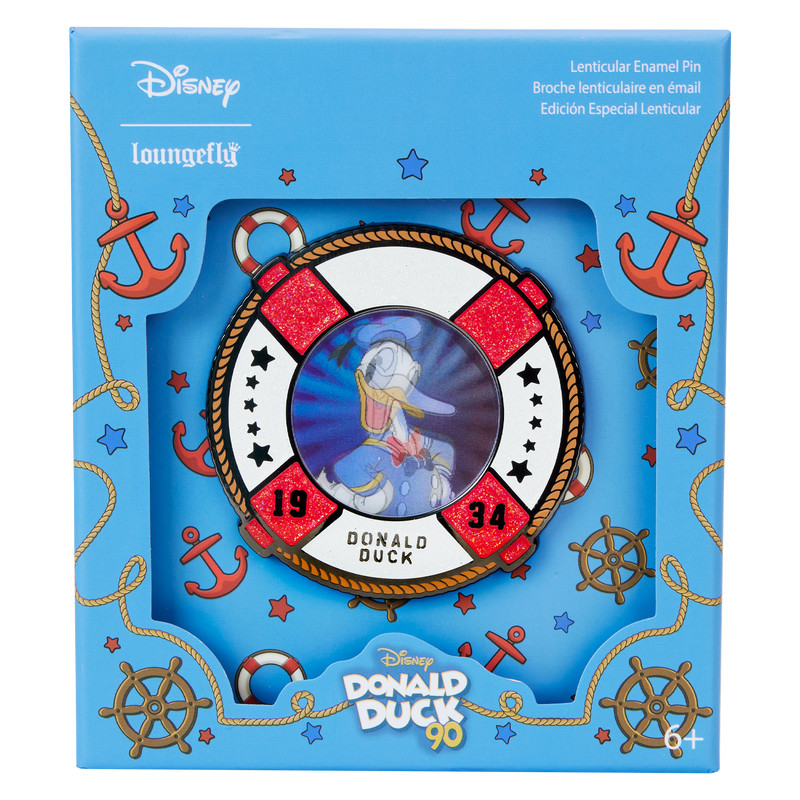 Una colección de pines con forma de barco no está completa sin un poco de brillo. Este pin especial de caja de coleccionista está listo para entrar en tu colección. En el frente de este pin de forma circular, el Donald Pato de Disney hace una aparición estelar. Está en el centro de un salvavidas y encontrará su nombre y fecha (1934) escritos a continuación. El Donald Pato aparece a todo color, pero con un movimiento de muñeca (gracias a las características lenticulares) también aparece en blanco y negro. Glitter decora los bordes del salvavidas para agregar brillo extra. Haz olas mientras celebras el 90.º aniversario del Pato Donald.