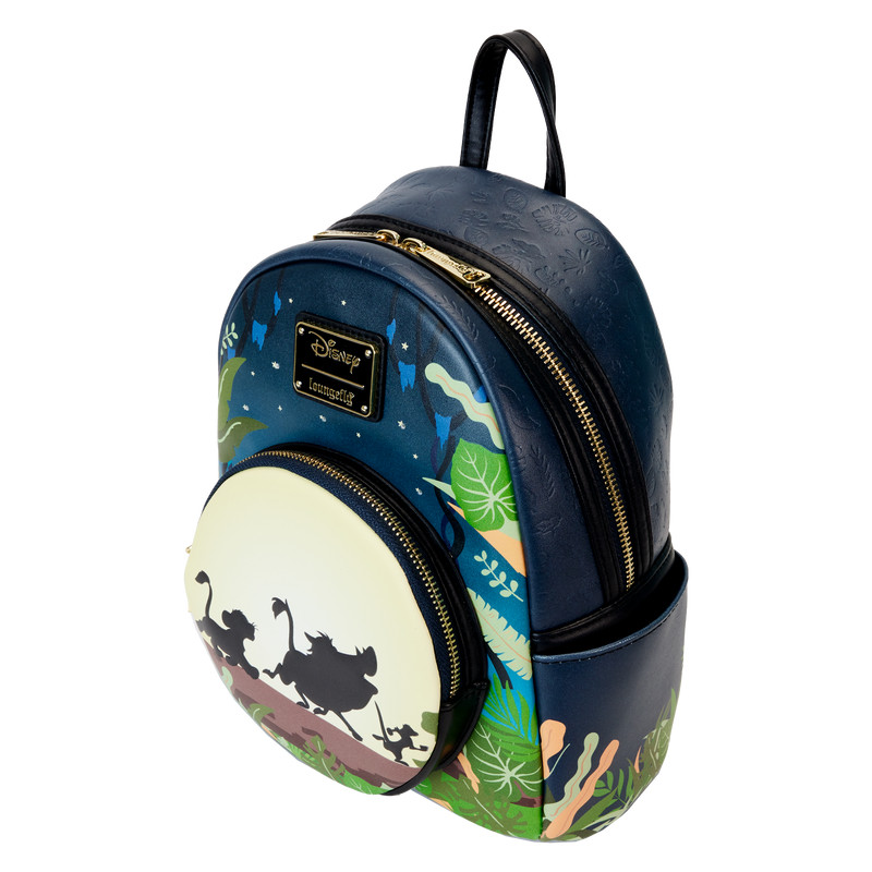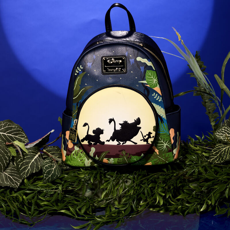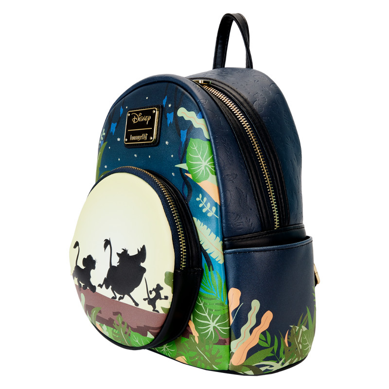 ¡Relájate y deja volar tu estilo de vida sin preocupaciones! La Mini Mochila Loungefly El Rey León 30th Anniversary Hakuna Matata Silhouette aporta un nuevo aspecto relajado a tu ambiente diario. En el frente, una luna llena se eleva en el bolsillo frontal con cremallera de la bolsa mientras Timón, Pumba y Simba caminan sobre un tronco. Arriba, un fondo frondoso enmarca un cielo nocturno estrellado. ¡Apaga las luces para ver la luna brillar en la oscuridad mientras las estrellas se iluminan con funciones de iluminación LED! Un dije de cremallera esmaltado del 30.º aniversario acompaña el bolsillo con cremallera, y los estampados de hojas en relieve se unen a la exuberante vegetación en los costados del bolso. En la parte trasera aparece el retrato de Simba con el logo del aniversario. Ya sea que te estés tomando las cosas con calma o explorando la sabana, esta mini mochila te mantendrá fresco y relajado.