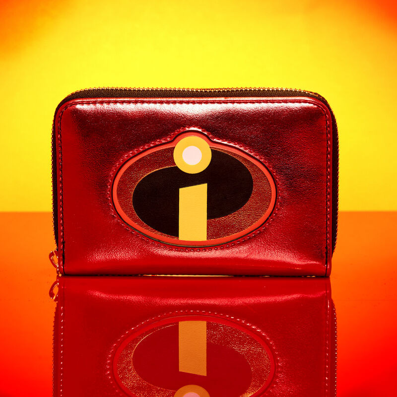 La billetera Loungefly Pixar los Increíbles con cremallera presenta cuero vegano metálico y brillante (poliuretano ), cierre con cremallera, herrajes dorados brillantes, cuatro ranuras para guardar tarjetas, ventana de identificación transparente troquelada, detalles impresos y apliques, forro a juego del 20.º aniversario.