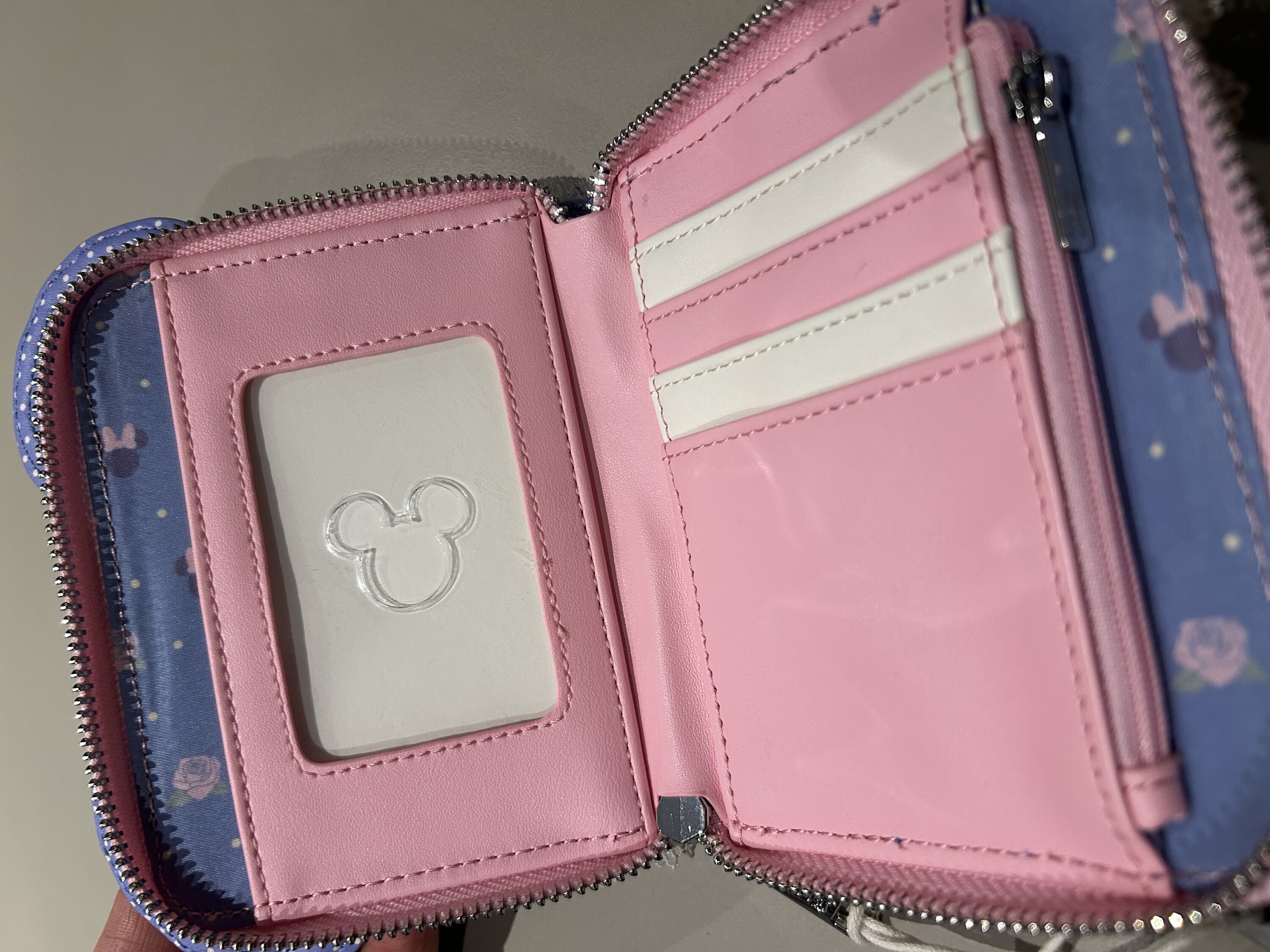 Características: herrajes metálicos plateados, aproximadamente cuatro ranuras para tarjetas, compartimento con cremallera, una ranura transparente para mostrar su identificación, con una forma troquelada de las orejas de Mickey Mouse de Disney, apliques, estampado, lazo 3D, encaje y detalles bordados, forro interior a juego