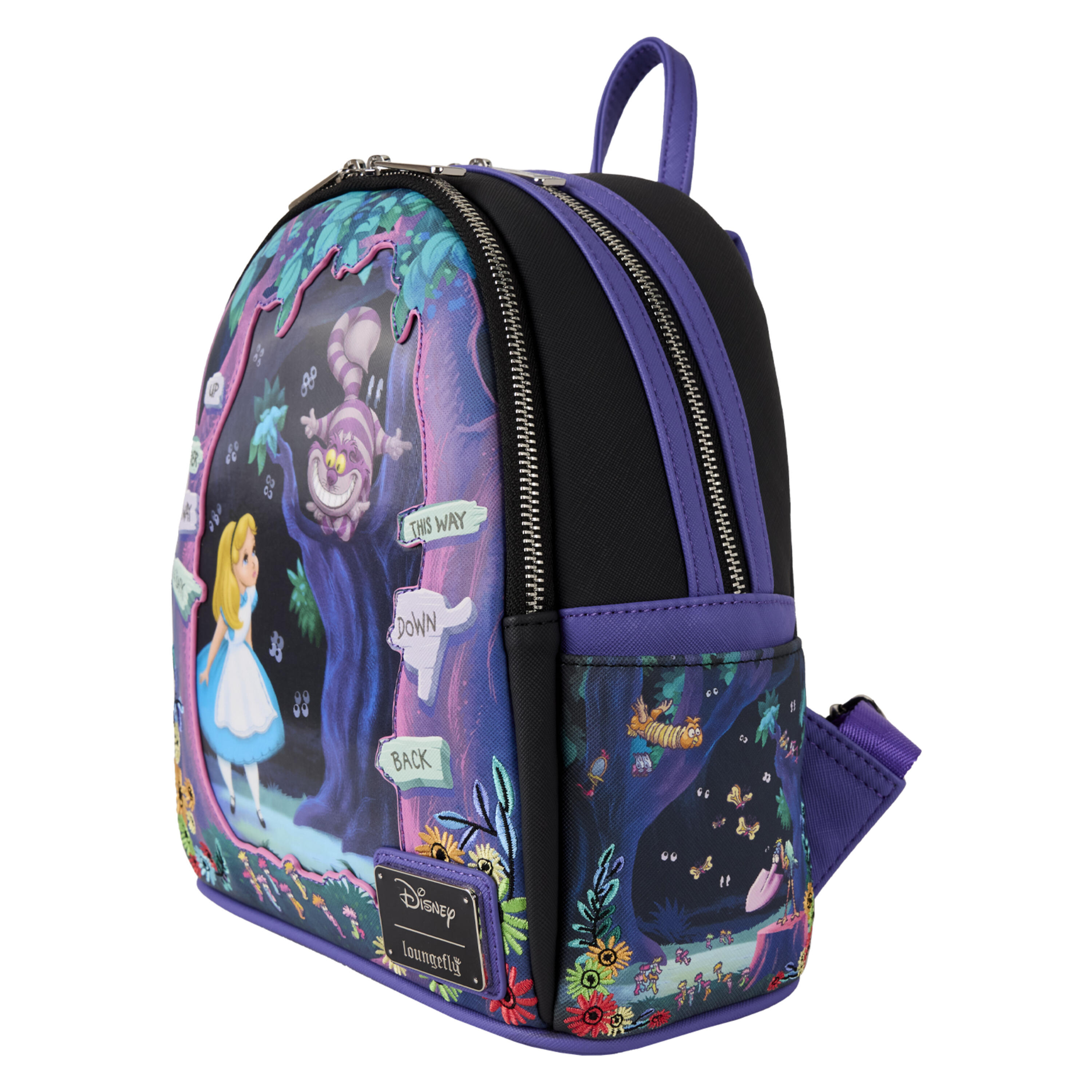 ¡Sumérgete en el mundo del estilo con esta mini mochila ! Alicia intenta abrirse camino a través del País de las Maravillas en la parte delantera. Mueve la mochila hacia adelante y hacia atrás y El Gato Rison aparece y desaparece en una forma lenticular. Imágenes del País de las Maravillas aparecen alrededor de Alicia en la parte delantera y en los bolsillos laterales.