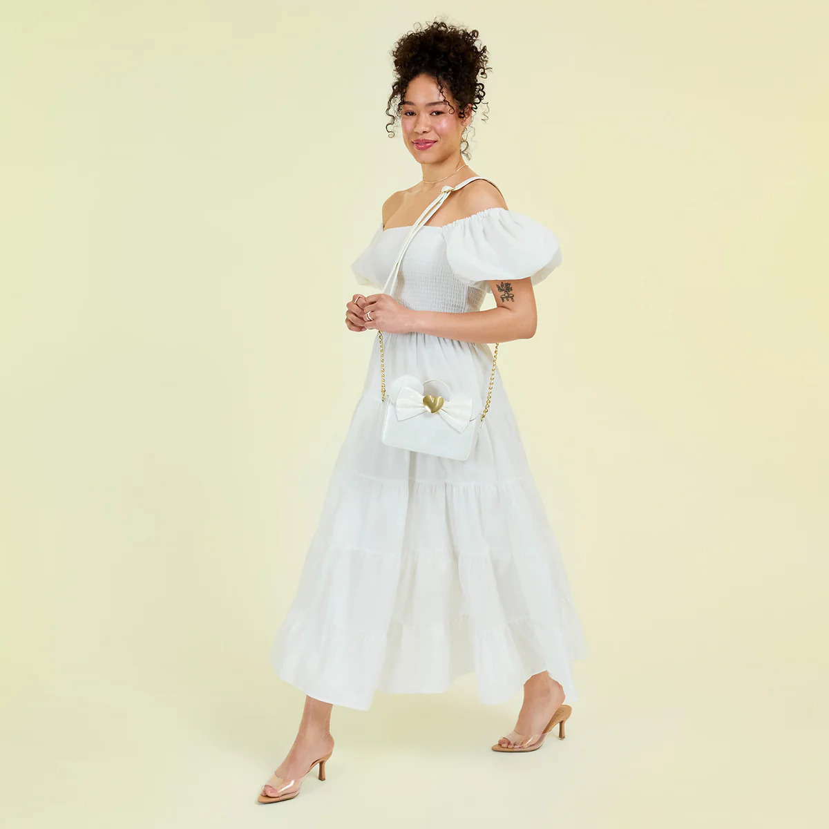 Haz que cada momento sea especial antes del gran día. Tanto si eres novia como si conoces a alguien que lo sea, este bolso bandolera es el accesorio perfecto para todo eventos, antes y después de la boda. Brilla con su reluciente piel sintética y su encaje iridiscente. Un dije de corazón de metal dorado moldeado en el centro del bolso bandolera le da un toque extra de brillo. ¡Un hermoso accesorio para combinar con la belleza de tu temporada de bodas!