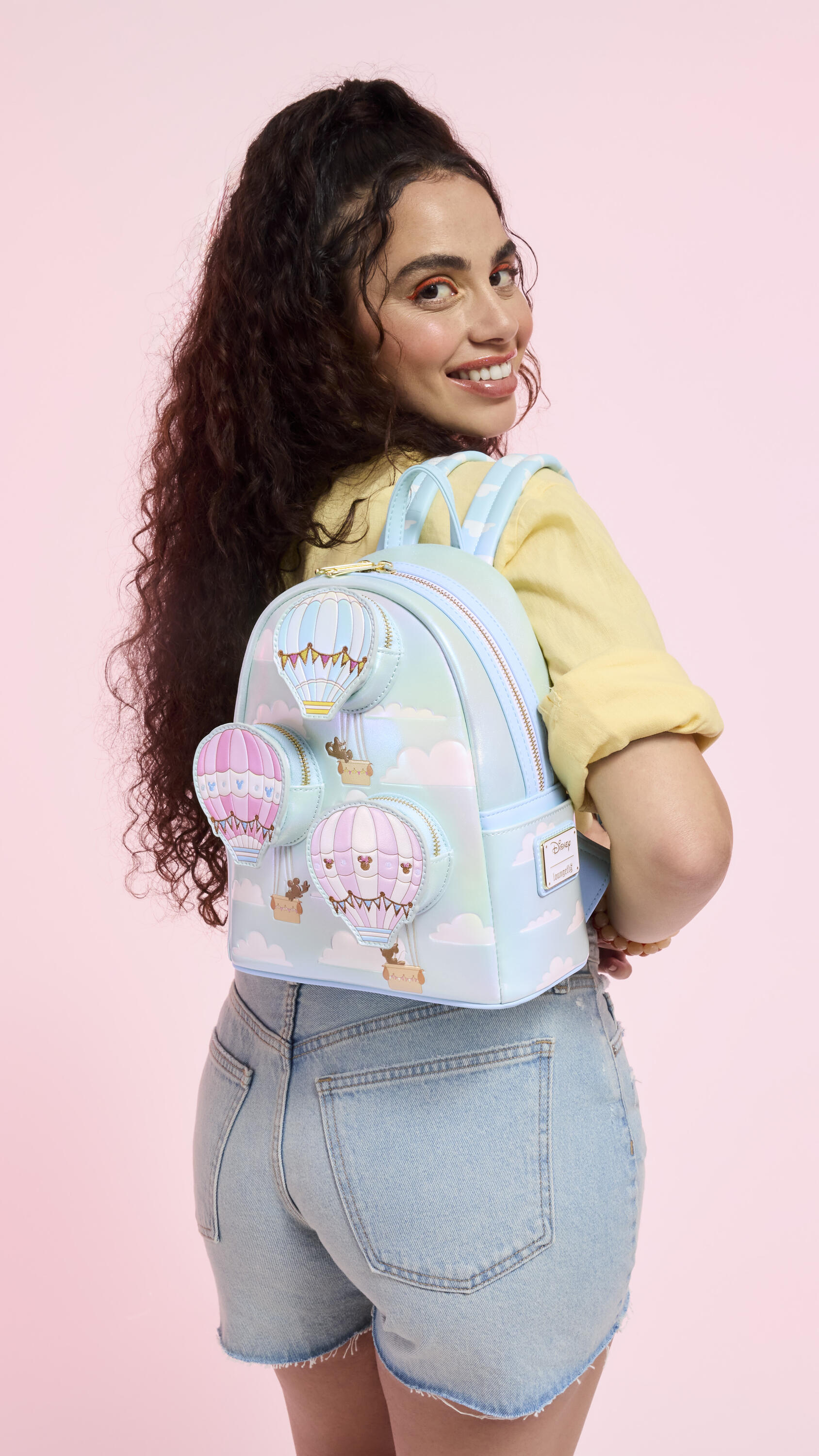 ¡Surca los cielos con un adorable estilo Disney ! Esta mini mochila cuenta con tres minibolsillos frontales que parecen globos aerostáticos flotando entre las nubes. Fíjate bien: encontrarás las siluetas de algunos de tus personajes favoritos de Disney en las cestas. El material perlado y las nubes ilustradas en las correas completan el look.