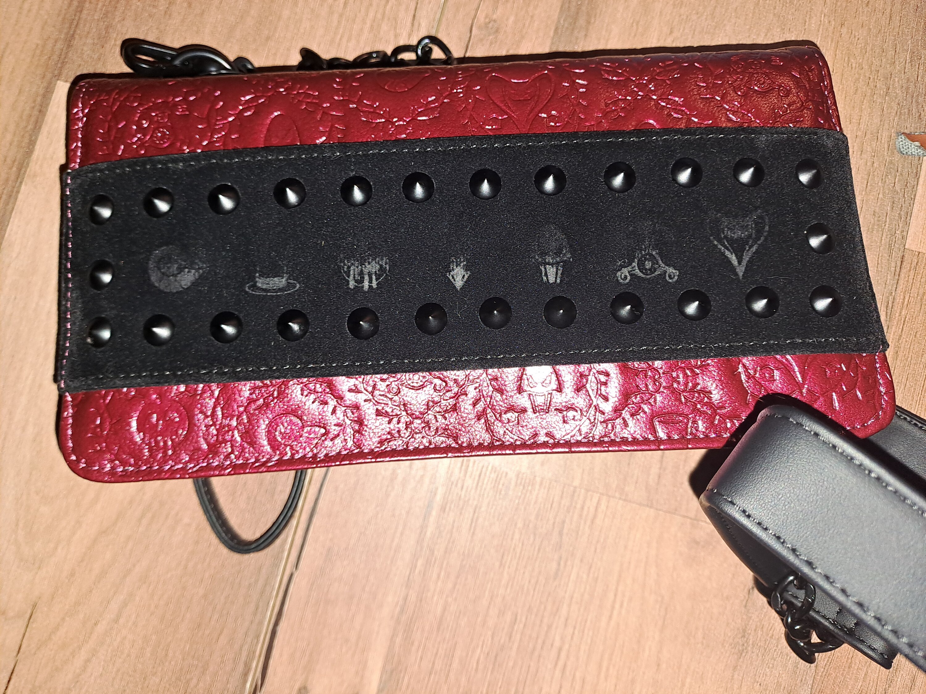 ¿A quién no le encanta un clutch de villanos? ¡Celebra a tus villanos favoritos de Disney con este clutch! Encuentra símbolos de villanos populares de Disney grabados en relieve con espinas por todo el bolso. Los conos de tachuelas y el terciopelo completan el look. Este estilo es versátil: puedes llevarlo como clutch con la correa de muñeca o con la correa cruzada para llevarlo como un bolso. ¡Luce icónico mientras te lanzas a realizar tus malvados planes!