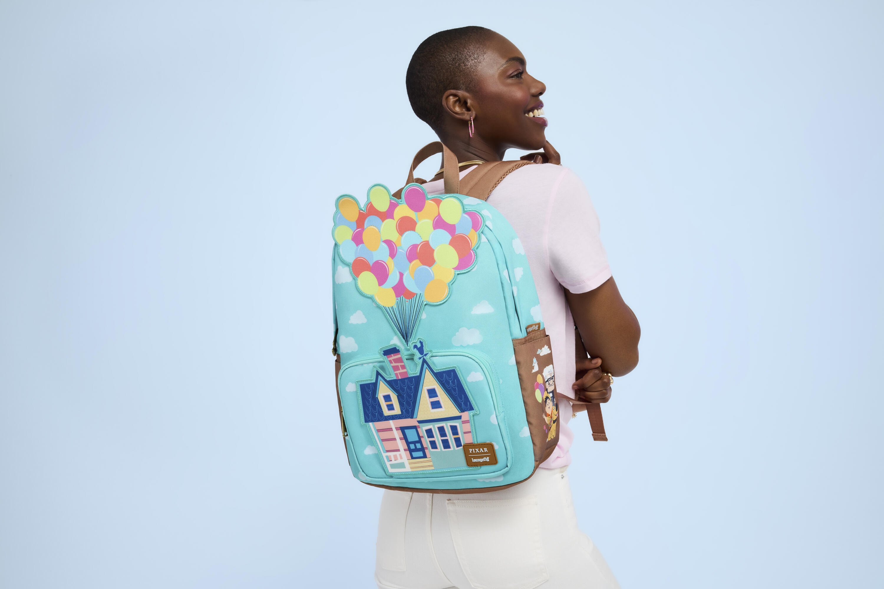 Este bolso de tamaño completo está inspirado en Up de Disney-Pixar. La parte delantera luce un estampado integral de nubes en un cielo despejado. El bolsillo delantero muestra la casa de Carl, sobre la cual se extiende un aplique de globos. ¡Echa un vistazo a los bolsillos laterales para encontrar imágenes de algunos de tus personajes favoritos!