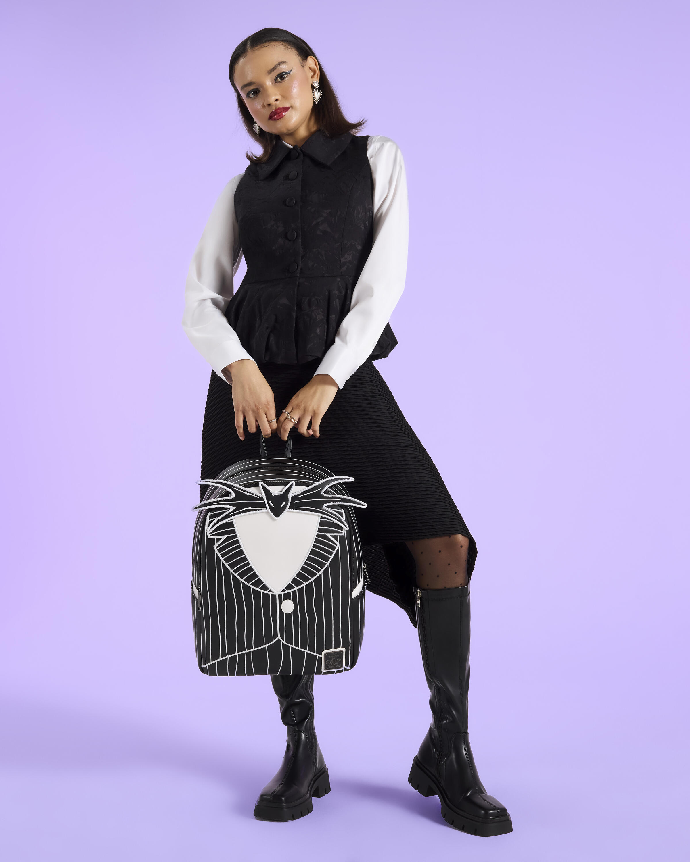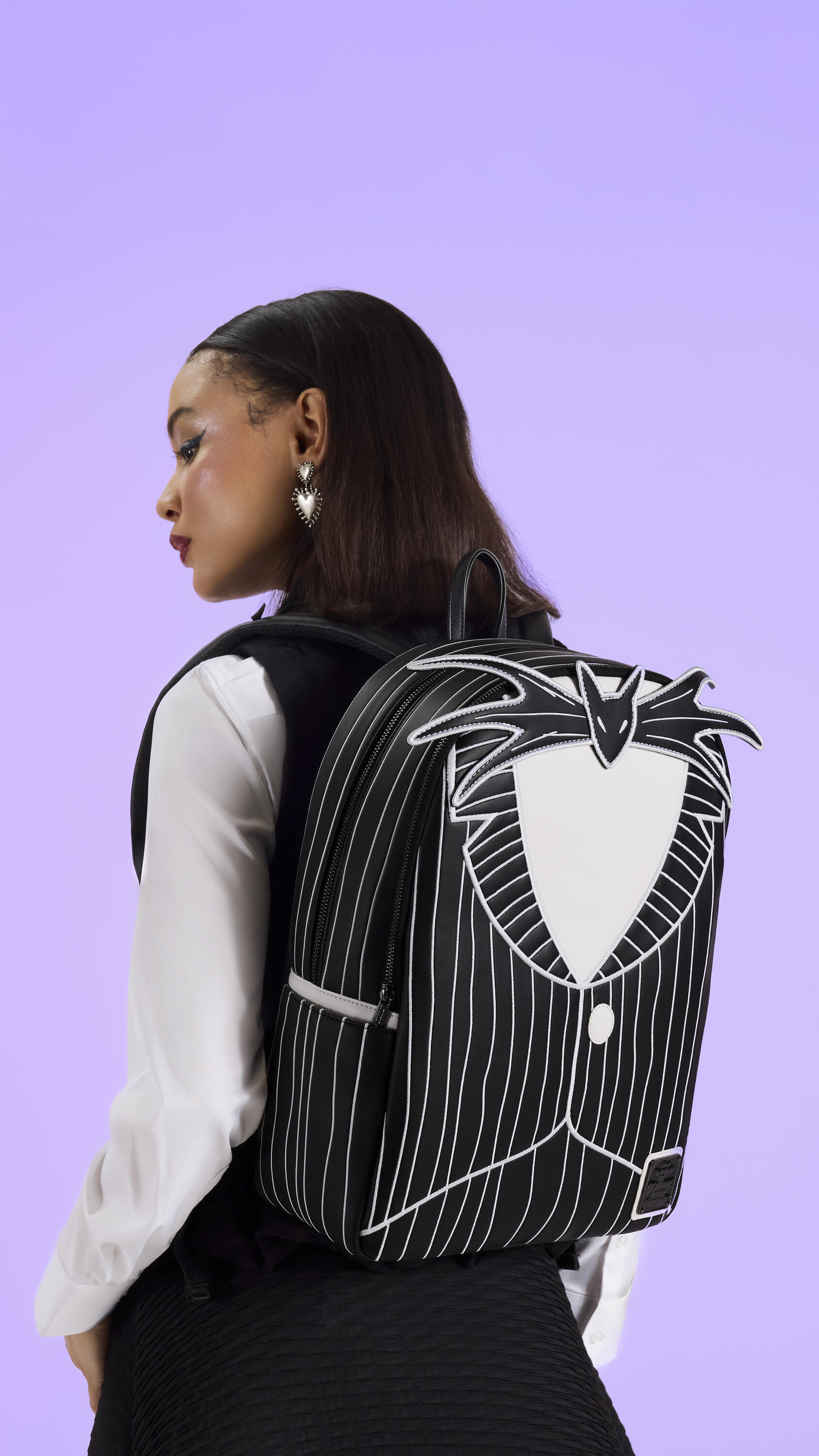 Esta mochilas de piel sintética está inspirada en el traje de Jack Skellington, con rayas blancas y su clásico moño de murciélago. Dale la vuelta a la mochila para descubrir murciélagos en las correas y una imagen de la cara de Jack bordada en la espalda. Ah, y para un poco de diversión extra espeluznante, ¡este bolso brilla en la oscuridad!
