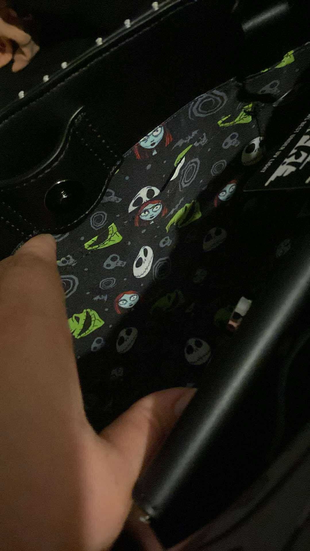 Este bolso de mano está inspirado en el traje de Jack Skellington, con detalles bordados de su traje de raya diplomática. Un asa metálica sobresale de la parte superior y lleva un corbatín de murciélago esculpido en metal. ¡También brilla en la oscuridad!