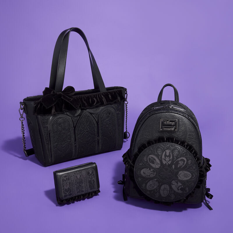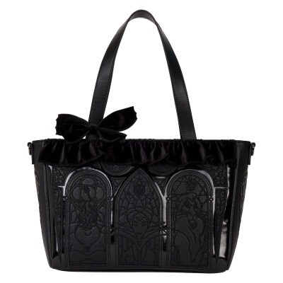Este bolsa tote es la pieza de moda de villano de Disney que estabas buscando. Luce un volante de terciopelo en la parte superior. En la parte inferior, encontrarás vidrieras con bordados en 3D que representan a tus villanos favoritos de Disney . La piel sintética metalizada y un lazo de terciopelo completan el look.