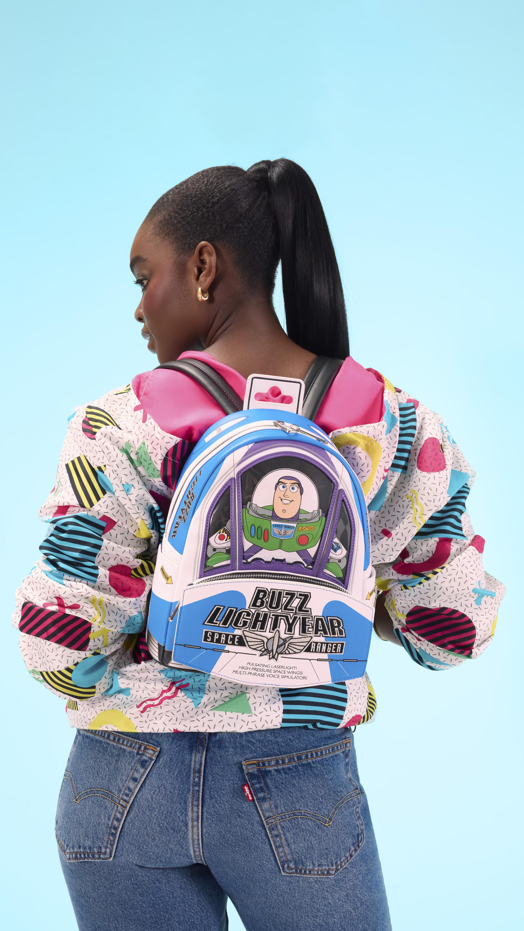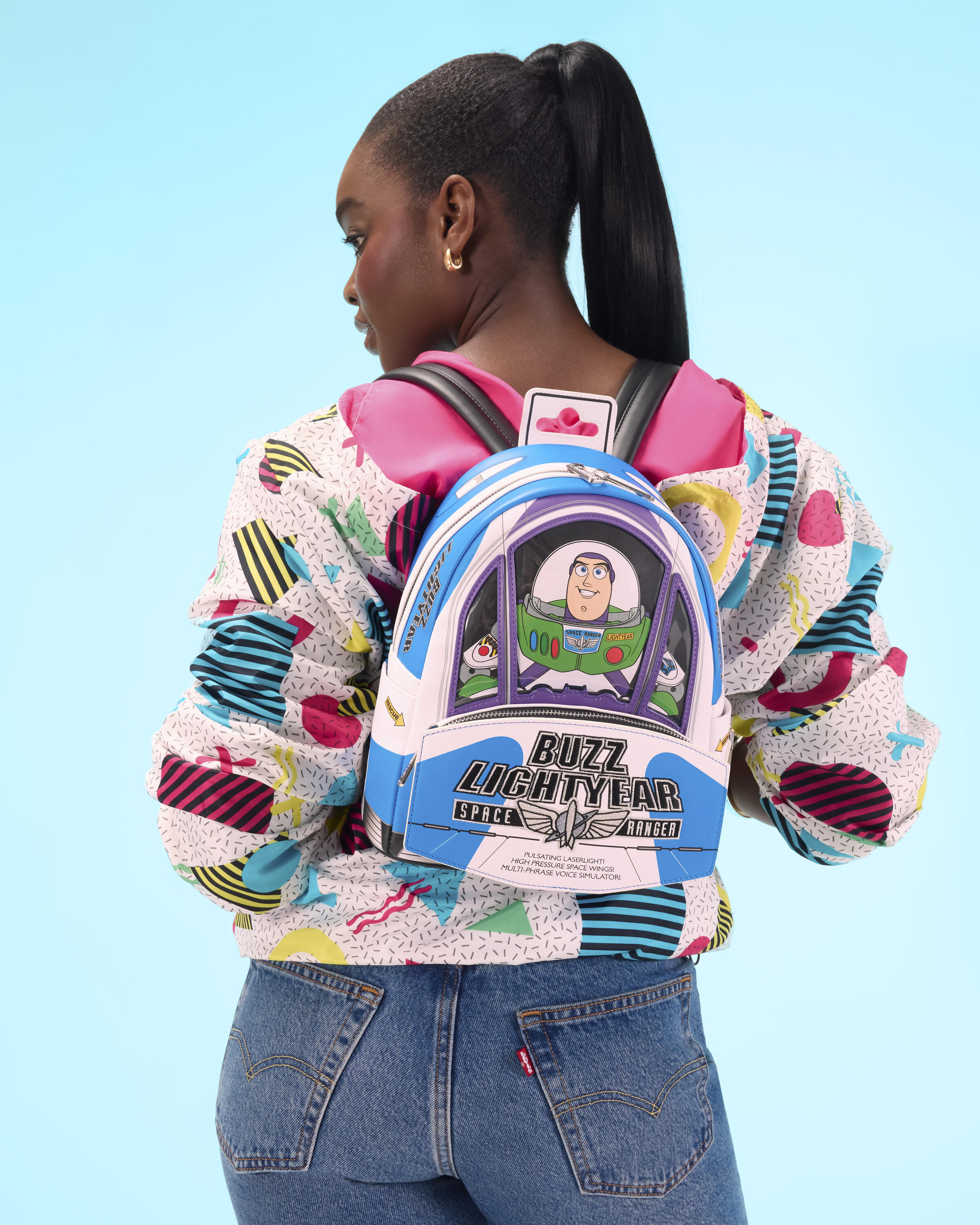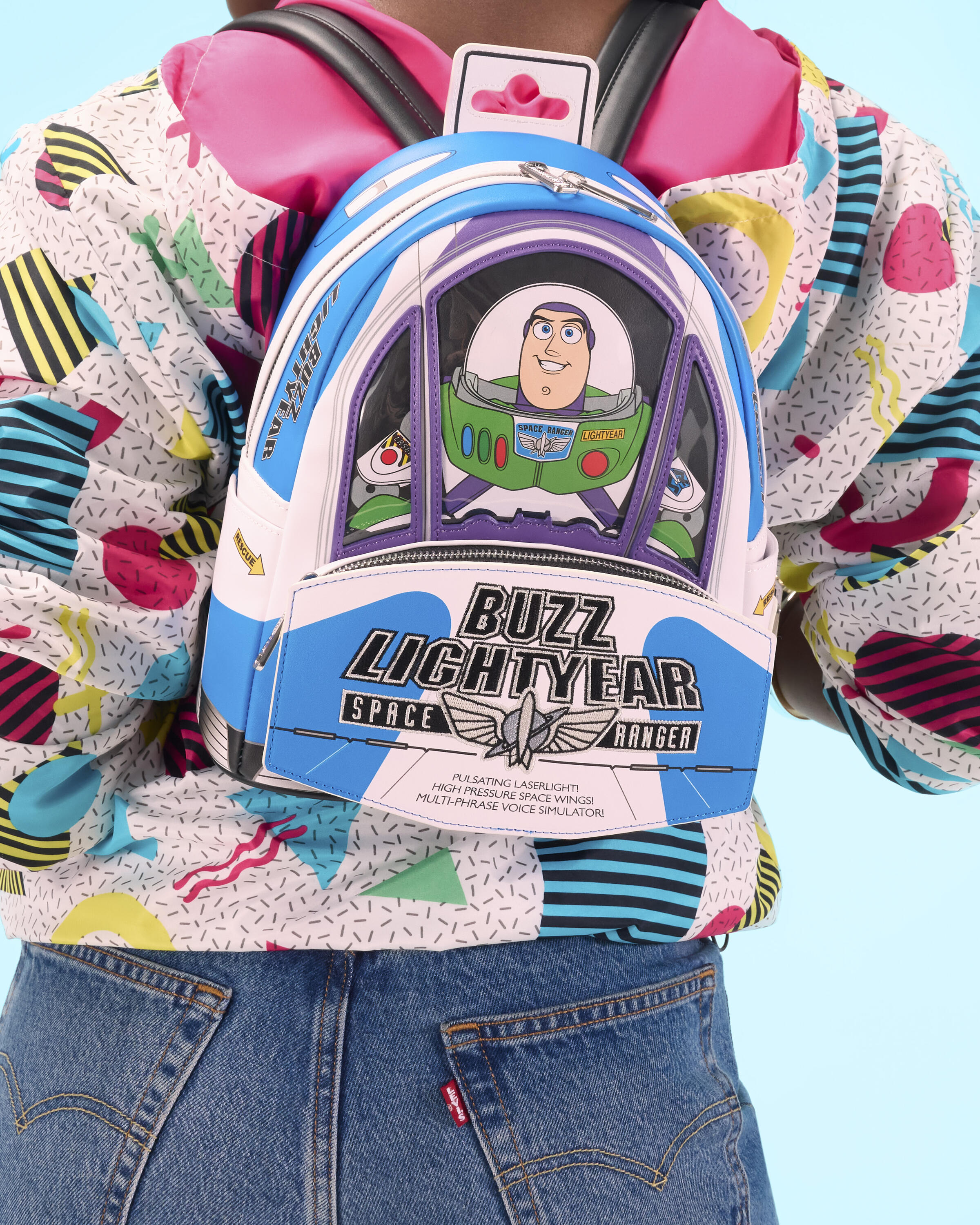 "¡Hasta el infinito y más allá!" Esta mini mochila es la manera perfecta de celebrar los 30 años de Toy Story de Disney. Esta mochila tiene la forma del empaque de Buzz Lightyear que se ve en la película; parece su nave espacial con alas que sobresalen a un lado y PVC transparente en el frente a través del cual se puede ver a Buzz Lightyear. Para hacerlo aún más especial, ¡este bolso reproduce sonido y brilla en la oscuridad!