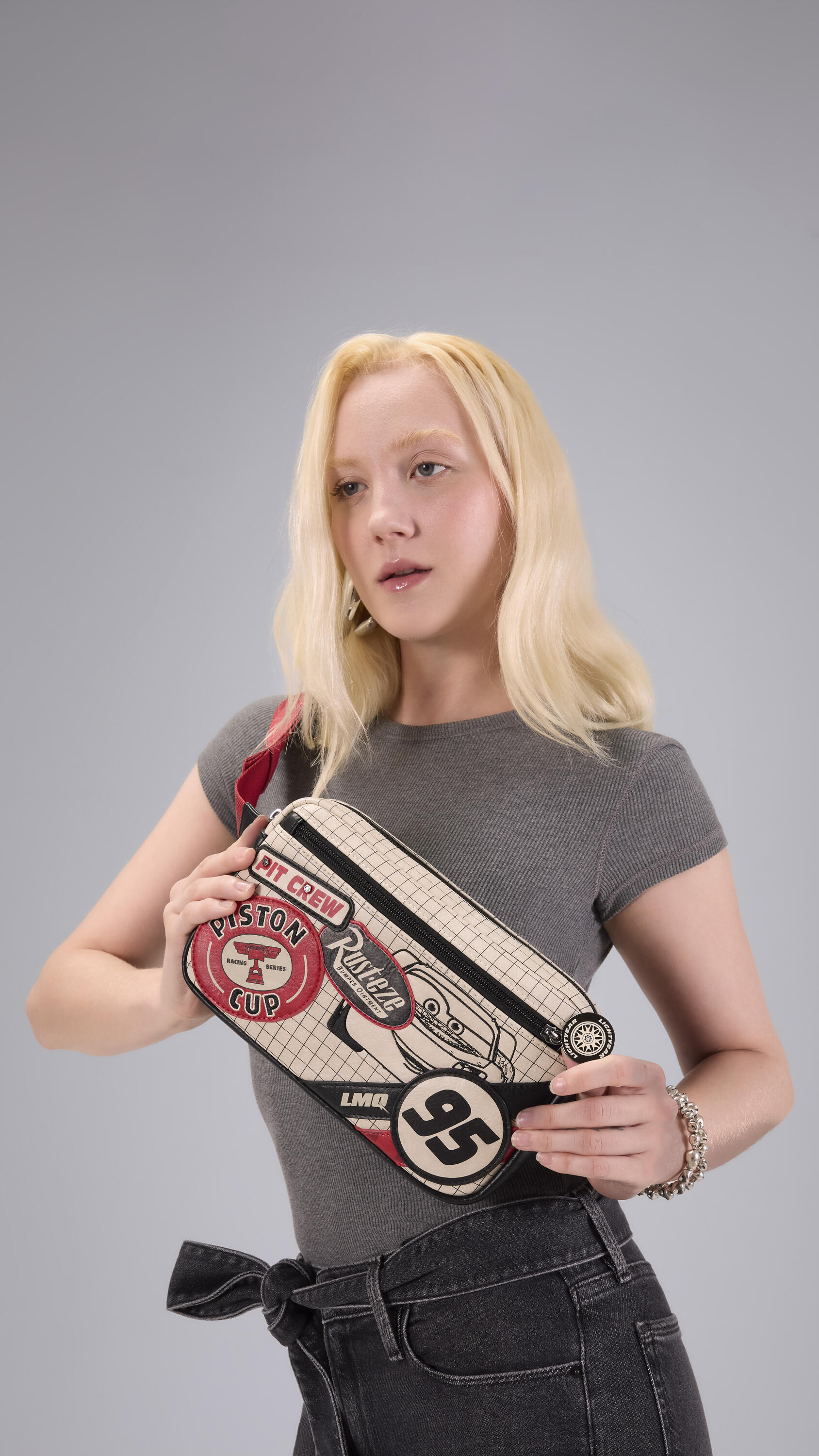 ¡Acelera con estilo con esta nueva bandolera! Esta bandolera presenta cuero sintético desgastado, tachuelas metálicas moldeadas y detalles bordados que parecen pegatinas en la parte delantera. Encontrarás pegatinas que dicen "Pit Crew", "Rust-eze", "Piston Cup" y mucho más. Este bolso es un accesorio muy divertido, elegante y una forma fantástica de celebrar una de tus películas favoritas.
