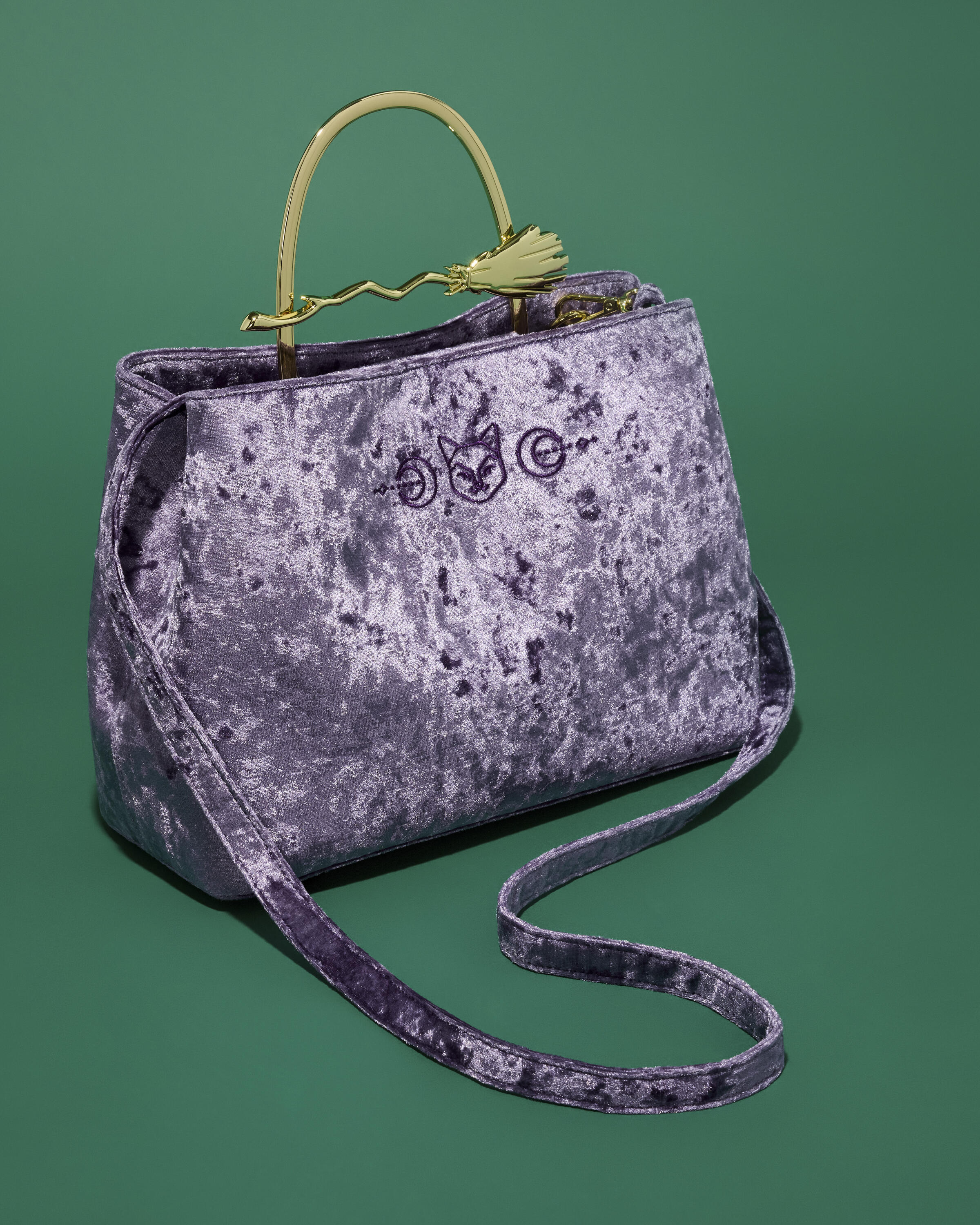 Este bolso de mano de terciopelo morado tiene ribetes de piel sintética. Encontrarás símbolos bordados en la parte delantera: lunas crecientes y un gato. El asa superior es de metal dorado moldeado y presenta una escoba de bruja.