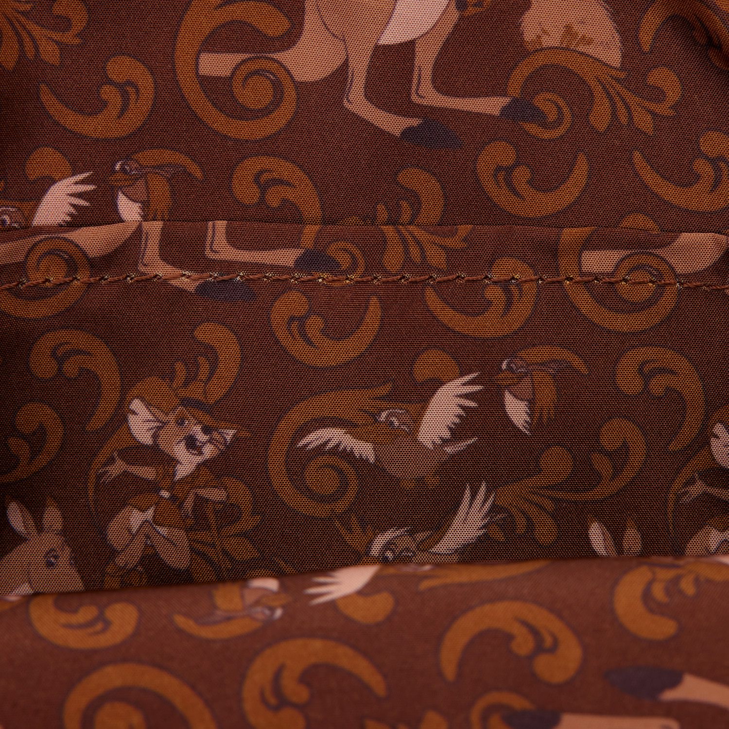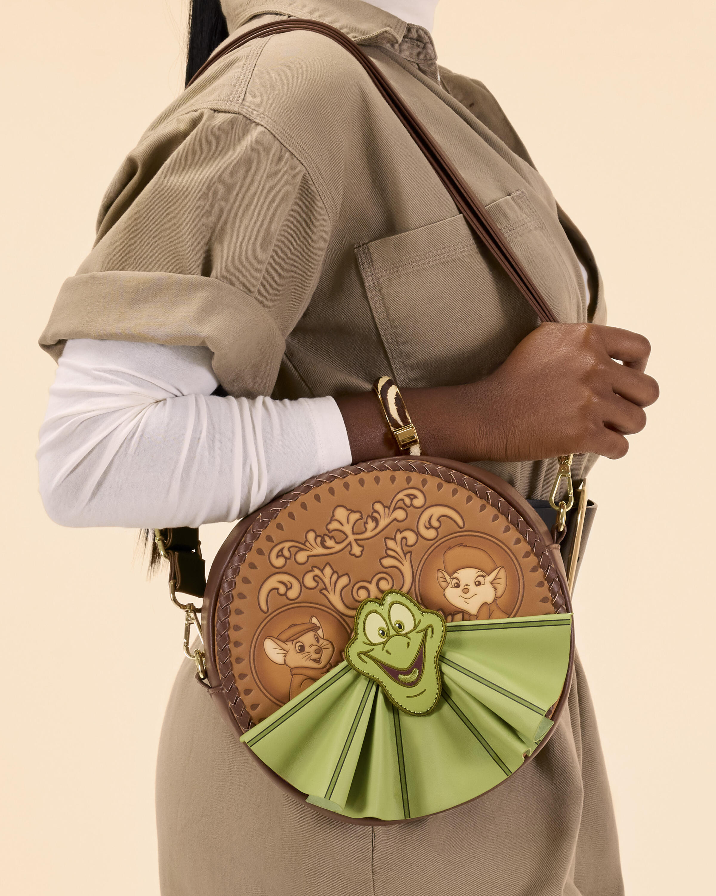 Este bolso bandolera tiene forma de círculo y luce a Frank en la parte delantera. Detrás, encontrarás diseños en relieve de Bernard y Miss Bianca. El volante del cuello de Frank se extiende hacia arriba y cubre la parte delantera del bolso. Dale la vuelta al bolso para descubrir más detalles en relieve, como la silueta de un albatros.
