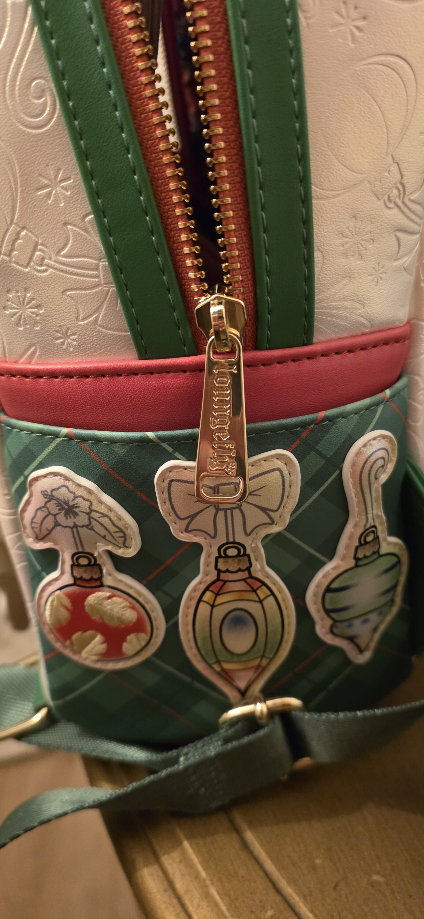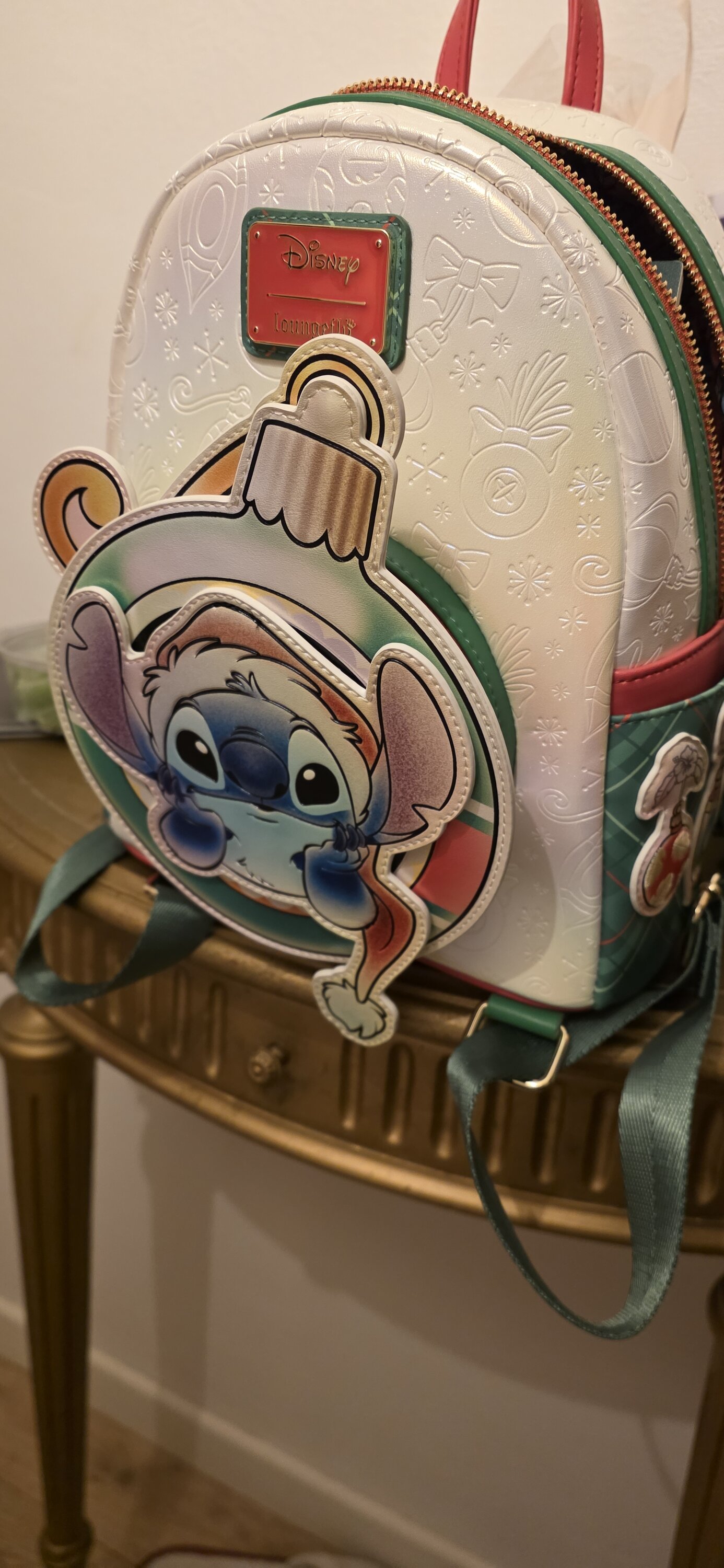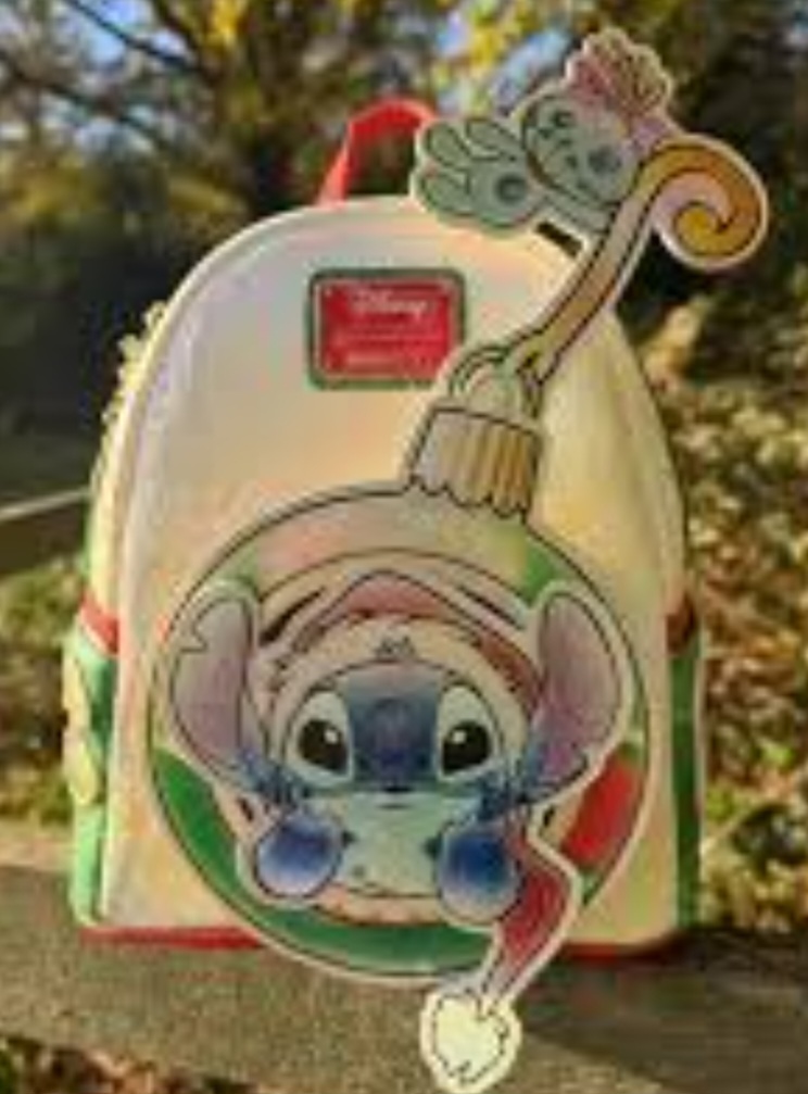 ¡Esta mini mochila está lista para celebrar las fiestas! Encontrarás a Stitch asomando por un adorno sobre el bolsillo delantero. ¡Scrump se cuelga del gancho del adorno y se mueve de un lado a otro! El resto de la mochila está decorada con diseños de adornos todo un fondo perlado. ¡Las correas a cuadros le dan un toque especial a todo el look!