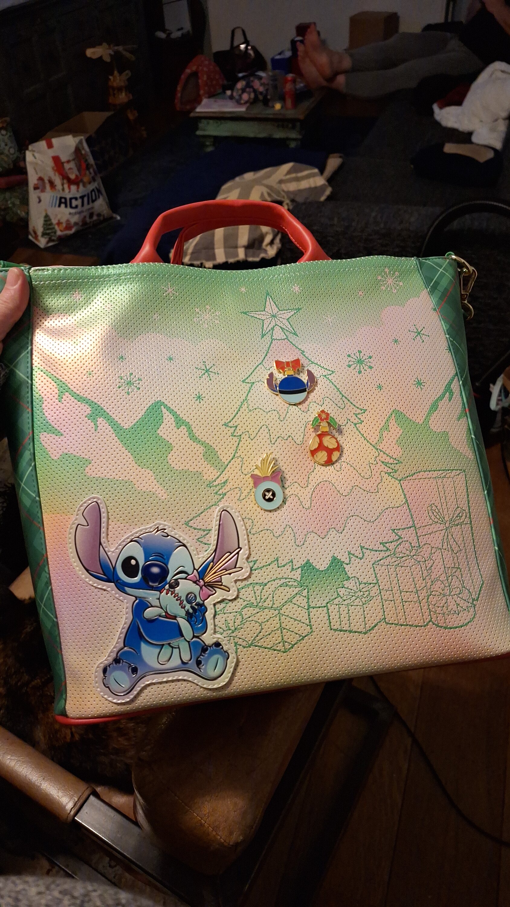 Esta bolsa tote presenta a Stitch sentado junto a un árbol de Navidad todo de regalos. La parte delantera es de piel sintética perforada. Incluye pins esmaltados con forma de adorno. ¡Puedes colocar los pins en la piel sintética perforada y decorar el árbol! Los laterales del bolso presentan cuadros escoceses con temática navideña y la parte trasera presenta varios símbolos holiday , como adornos y copos de nieve sobre un material perlado.