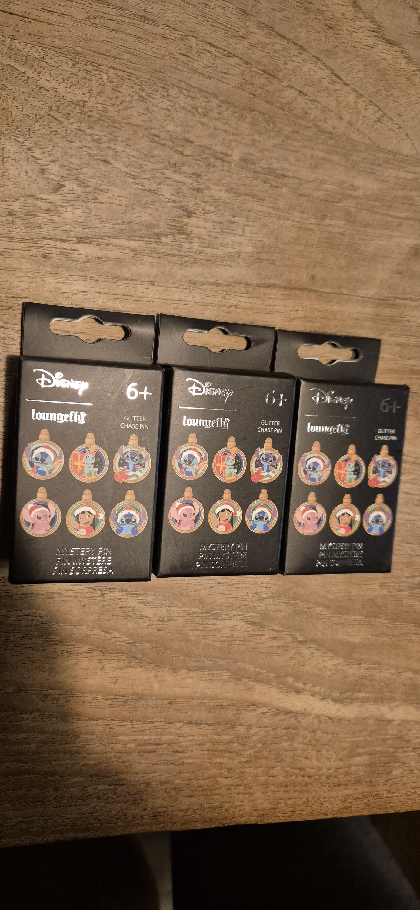 Estos pins misterio están inspirados en Lilo y Stitch de Disney. Cada uno viene en un empaque misterio , ¡así que no sabes cuál te tocará! Hay seis en total para coleccionar: Stitch y Scrump, Ángel, Scrump sentado sobre regalos, Stitch con un gorro de Papá Noel, Lilo con un gorro de Papá Noel, y el que persigue la purpurina es Stitch saliendo de un regalo con una diadema holiday .