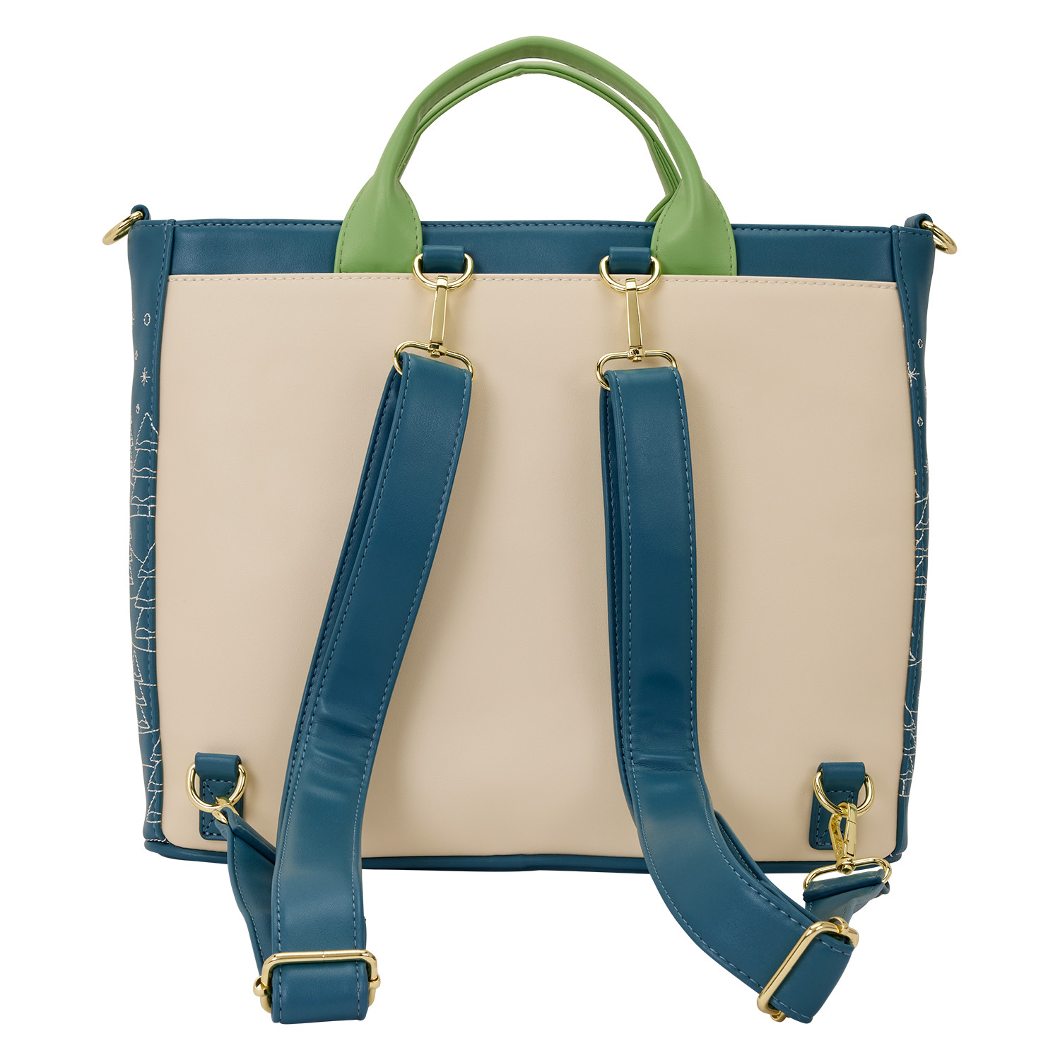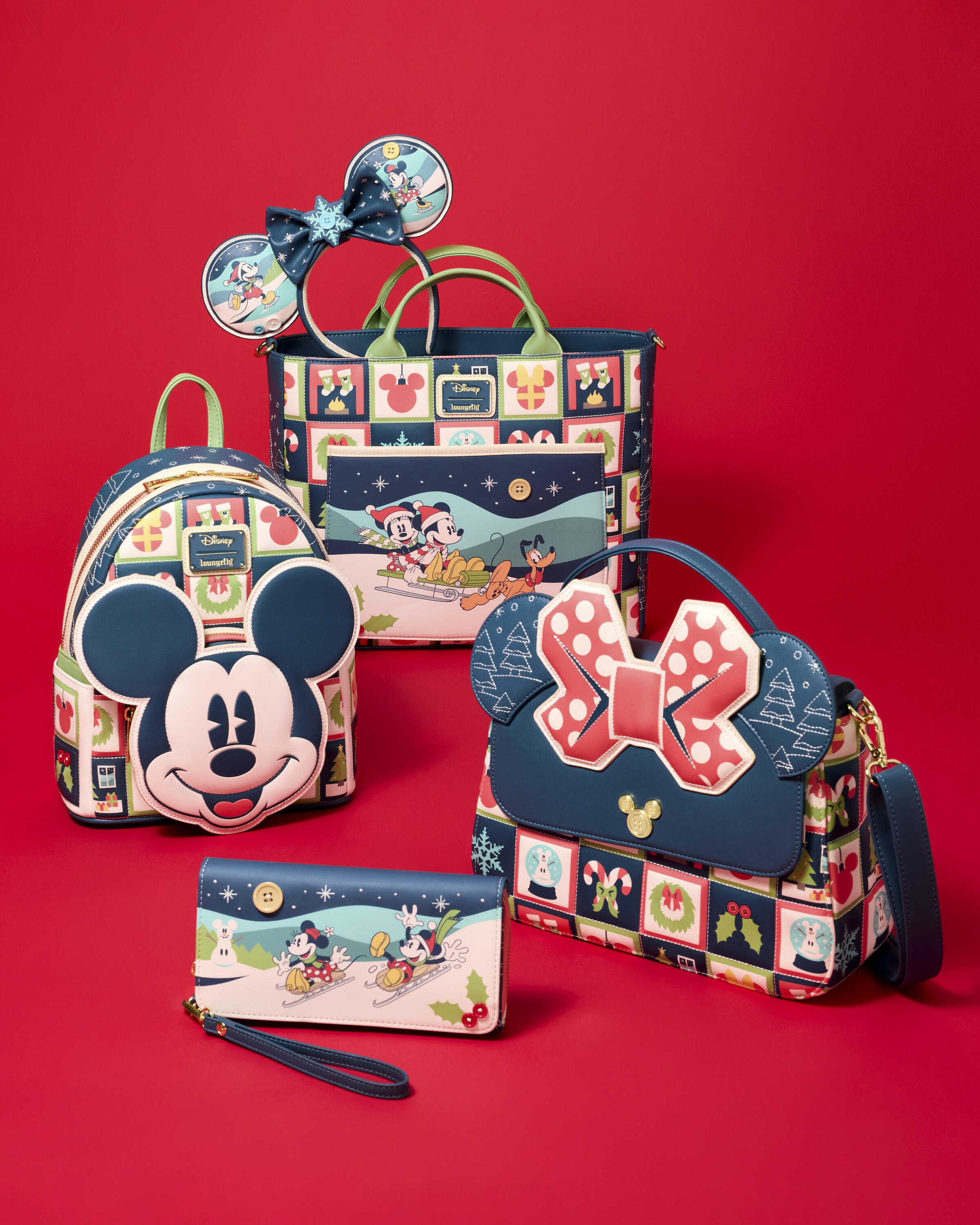 Este bolsa tote convertible se puede convertir en bolso tote y mochilas. Presenta una imagen de Mickey Mouse y Minnie Mouse en trineo por una colina con Pluto. También encontrarás un patrón acolchado y grabado con medias sobre el fuego, un adorno con forma de Mickey, un regalo con forma de Minnie, coronas y mucho más. El acolchado lateral muestra árboles de hoja perenne.