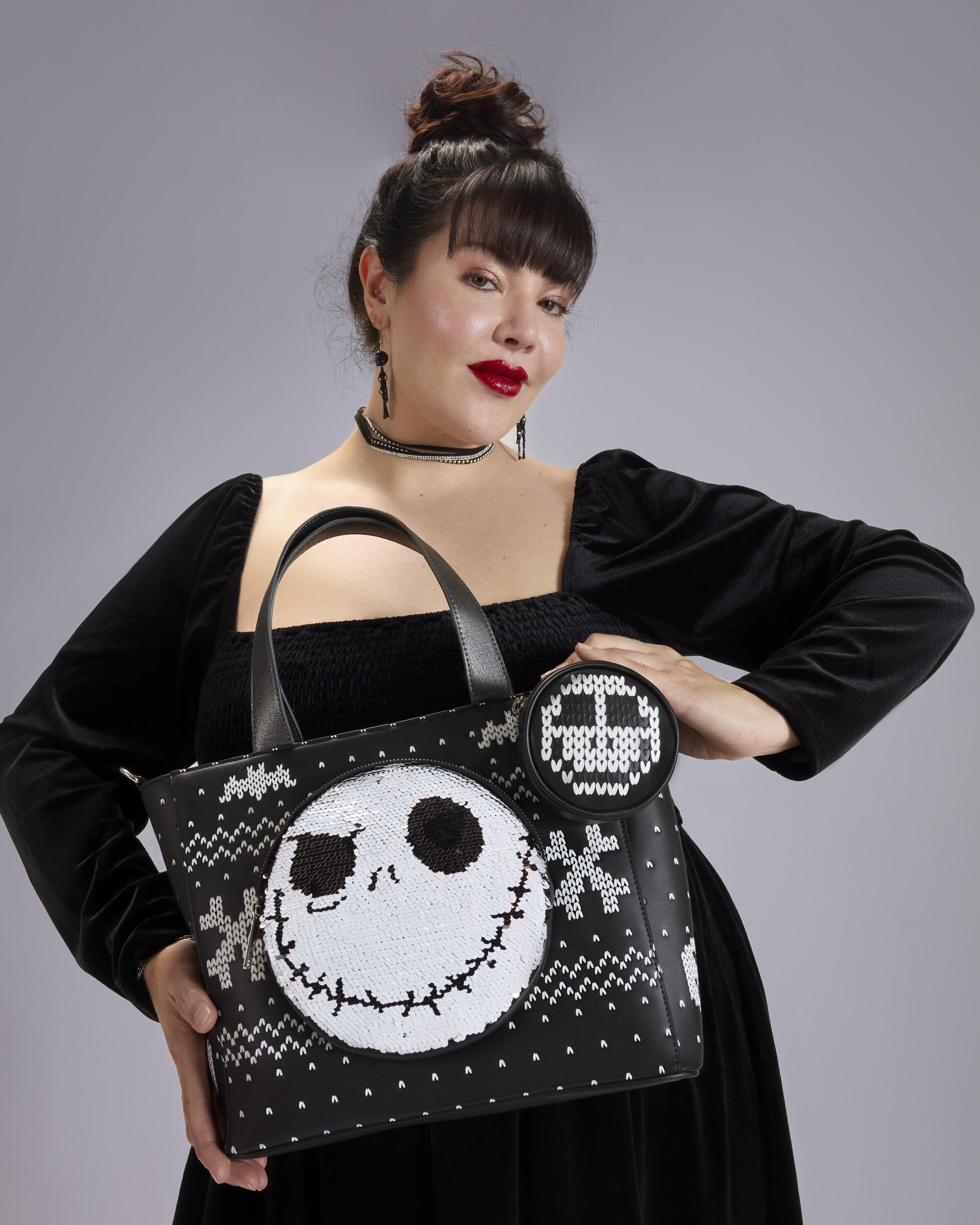 Esta bolsa presenta un diseño inspirado en un suéter holiday . Encontrarás murciélagos, diseños en zigzag y la palabra "Rey Calabaza" escrita en la parte trasera. En la parte delantera, encontrarás la cara de Jack Skellington hecha de lentejuelas. Las lentejuelas son reversibles, ¡así que la imagen se transforma en una calabaza! El monedero sujeto a la correa cruzada combina con la ilustración de Jack en el bolso y también se puede intercambiar entre él y una calabaza.