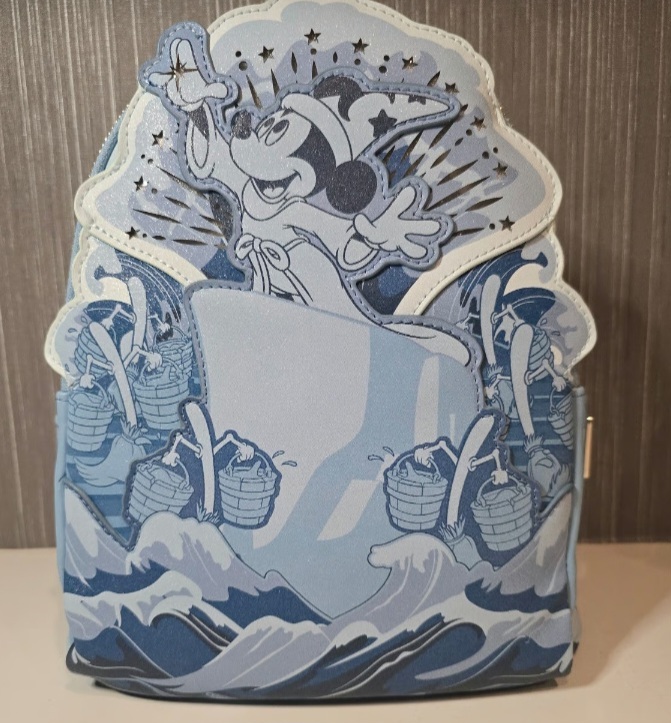 Esta mini mochila está inspirada en Fantasía de Disney. Encontrarás a Mickey el Hechicero en primer plano, lanzando magia (¡las estrellas a su alrededor se iluminan!). ¡A su alrededor, olas rompiendo y las Escobas Mágicas! El dorado metalizado y la piel sintética brillante hacen de esta una pieza muy especial.