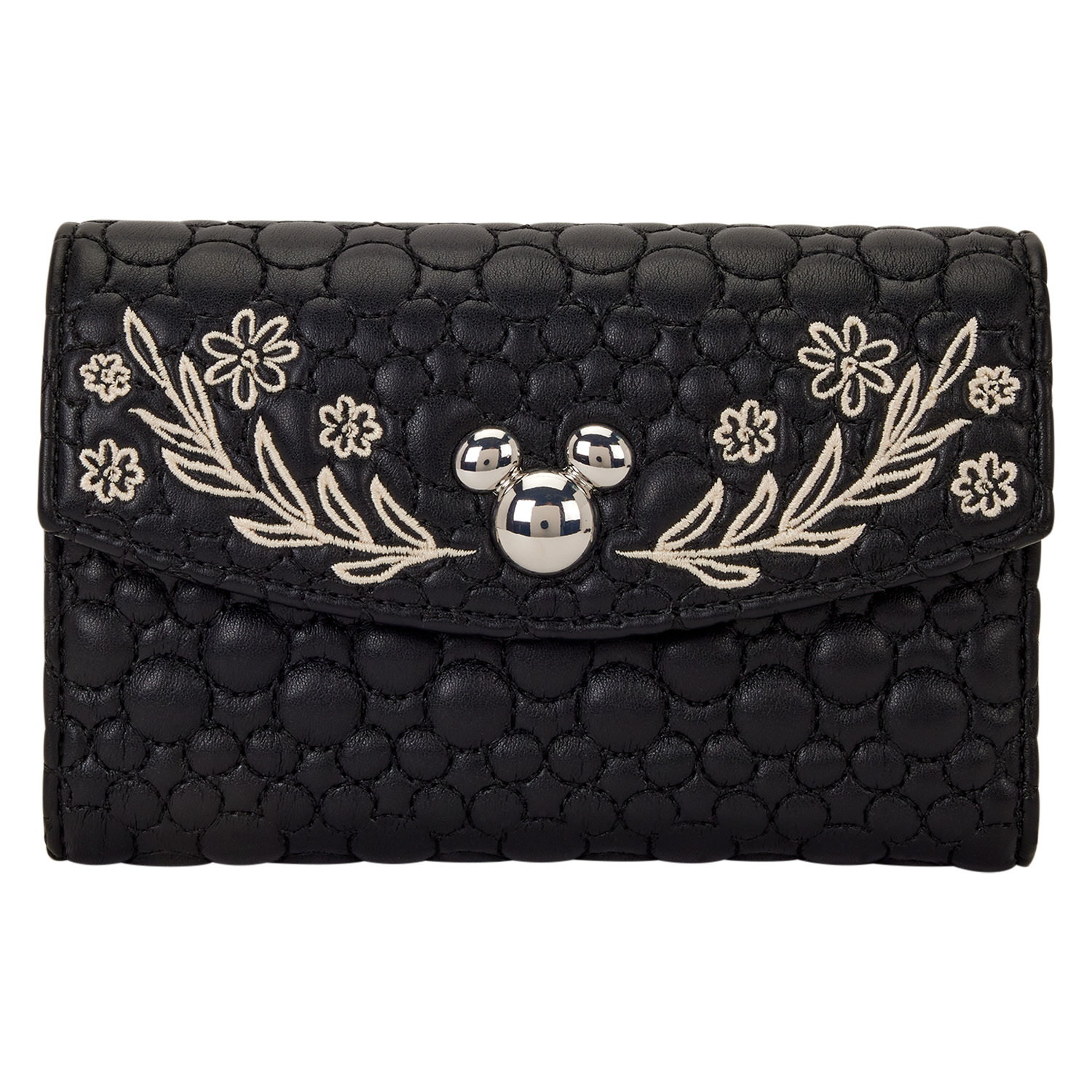 Esta cartera presenta un estampado todo con siluetas de Mickey Mouse . La solapa superior luce un dije metálico con la silueta de Mickey Mouse , flanqueado por detalles bordados de flores y hojas. En el interior, cuenta con siete ranuras para tarjetas y un compartimento transparente para el DNI. ¡Es el accesorio Disney perfecto para acompañarte durante todo el día!