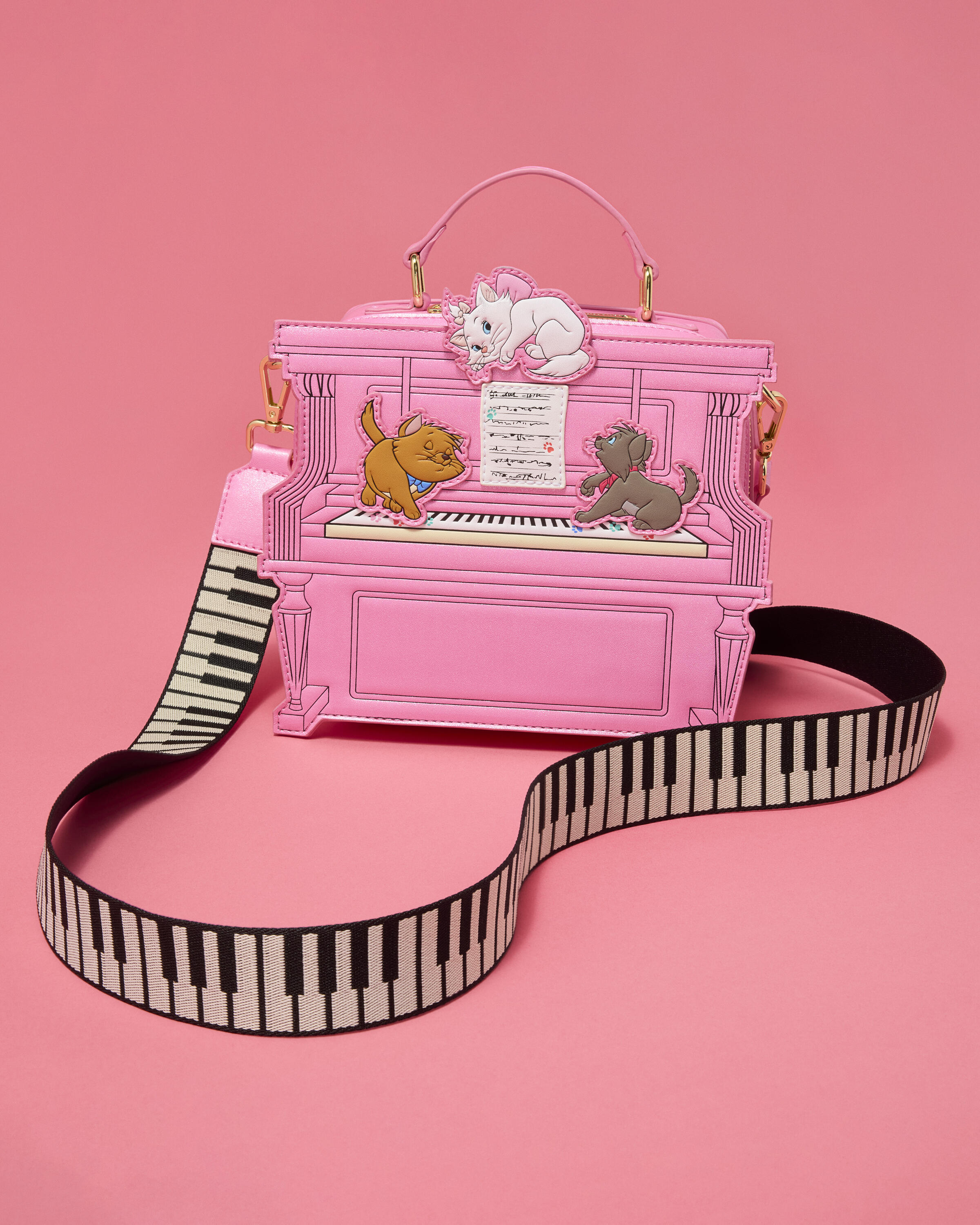 Este bolso bandolera con figuras tiene forma de piano. Encontrarás a Toulouse, Marie y Berlioz en el piano, mientras que Duchess y Thomas O'Malley bailan en la parte trasera. ¡La purpurina rosa le da un pop!