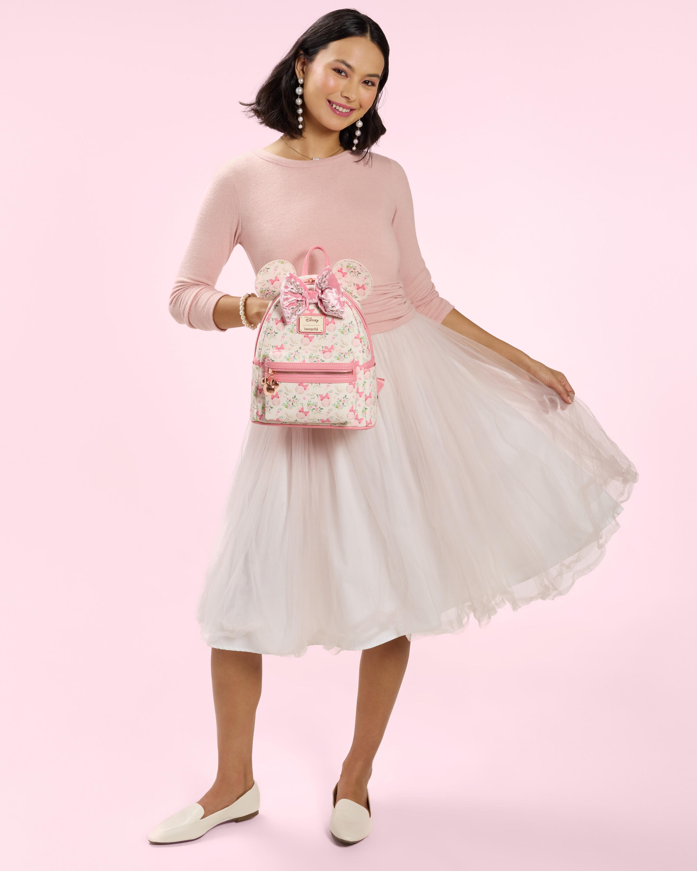 Esta mini mochila está inspirada en Minnie Mouse de Disney. Encontrarás orejas con apliques 3D y un lazo de terciopelo entre ellas. Todo el bolso, encontrarás un patrón repetido de siluetas de Minnie Mouse rodeadas de diseños florales. Las correas rosas le dan un toque único al look.