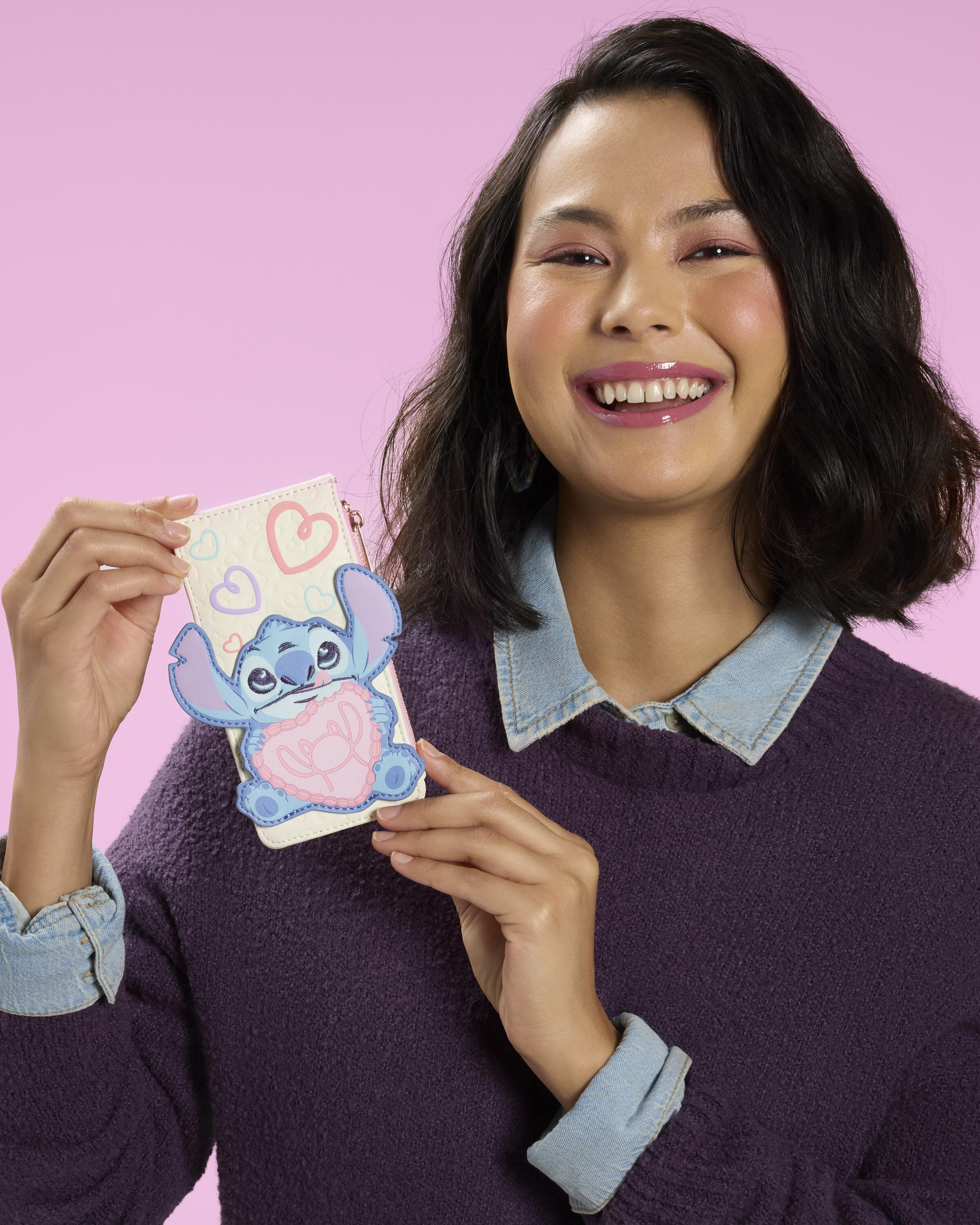 Prepárate para Dia De San Valentin con este adorable portatarjetas de Stitch . Encontrarás a Stitch en la parte frontal sosteniendo un pastel en forma de corazón con la silueta de un ángel estampada. Encontrarás un patrón de corazones en relieve todo la parte frontal y trasera del portatarjetas, ¡así como corazones con estampado abullonado! Dale la vuelta para encontrar cuatro ranuras para tarjetas rosas y azules.