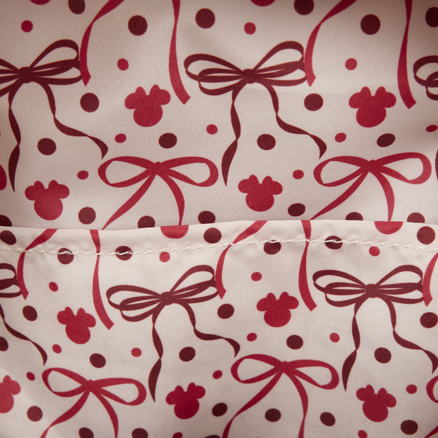Esta mini mochila es de color crema y rojo. Encontrarás lunares en relieve en el bolsillo delantero. En el resto del bolso, encontrarás siluetas de Minnie Mouse . Las cintas de satén le dan un toque adorable a los bolsillos laterales y a las orejas con apliques 3D. ¡También incluye un lazo rojo con lunares blancos entre las orejas! También encontrarás detalles de satén en las correas.