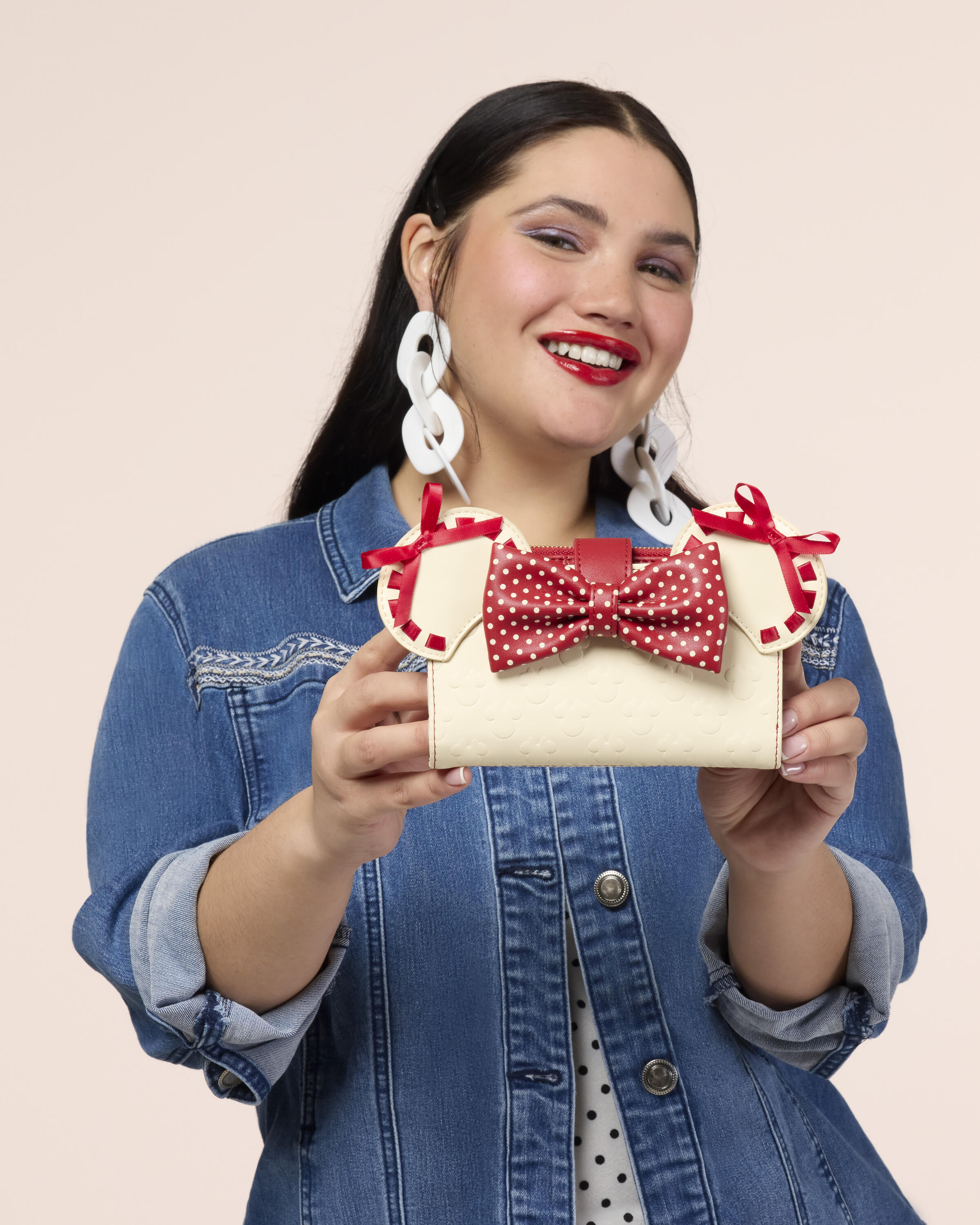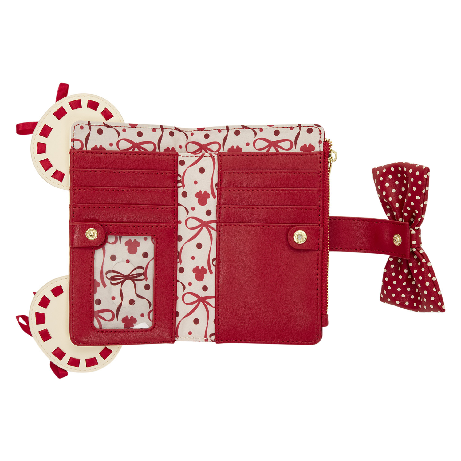 Esta billetera es perfecta para cualquier fan de Minnie Mouse que quiera darle un toque moderno y Disney a su día. Es de color crema y rojo. En la parte frontal, encontrarás un estampado en relieve de siluetas de Minnie Mouse , orejas 3D, detalles de cinta de raso y un lazo de lunares. La parte trasera es roja y luce lunares rojo oscuro. En el interior, hay siete ranuras para tarjetas y una ranura transparente para DNI.