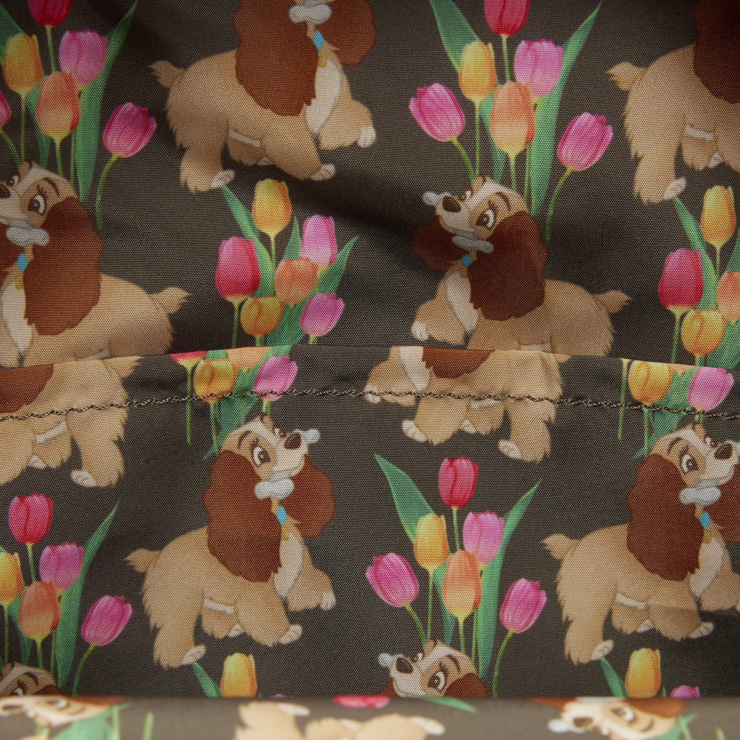 Esta mini mochila presenta a Lady, de "La Dama y el Vagabundo", de Disney. Aparece en el bolsillo delantero con un hueso en la boca. Camina por un campo de tulipanes. En la parte trasera, encontrarás su caseta de perro, que dice "Lady". ¡Los detalles bordados realzan la imagen de esta mochila !