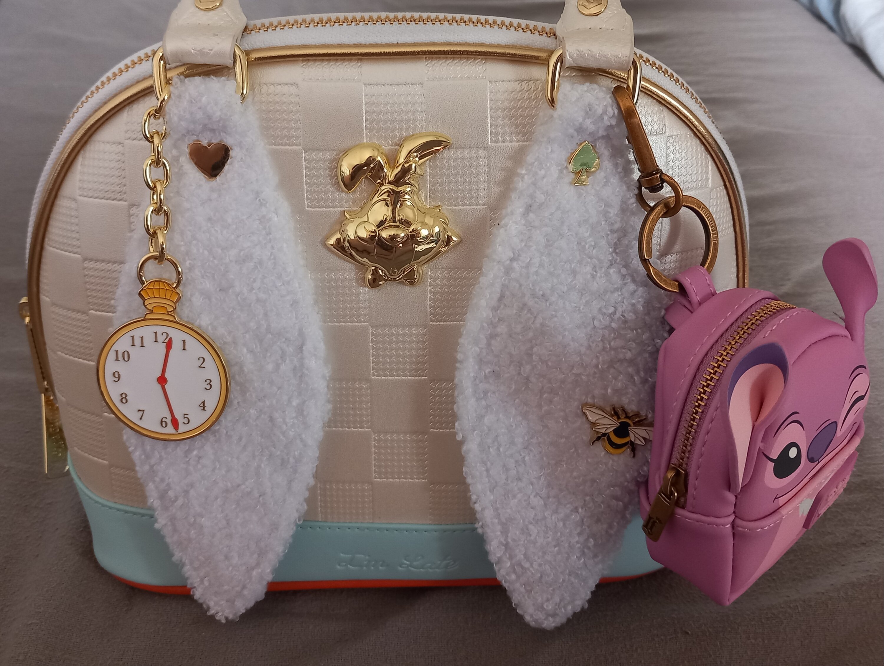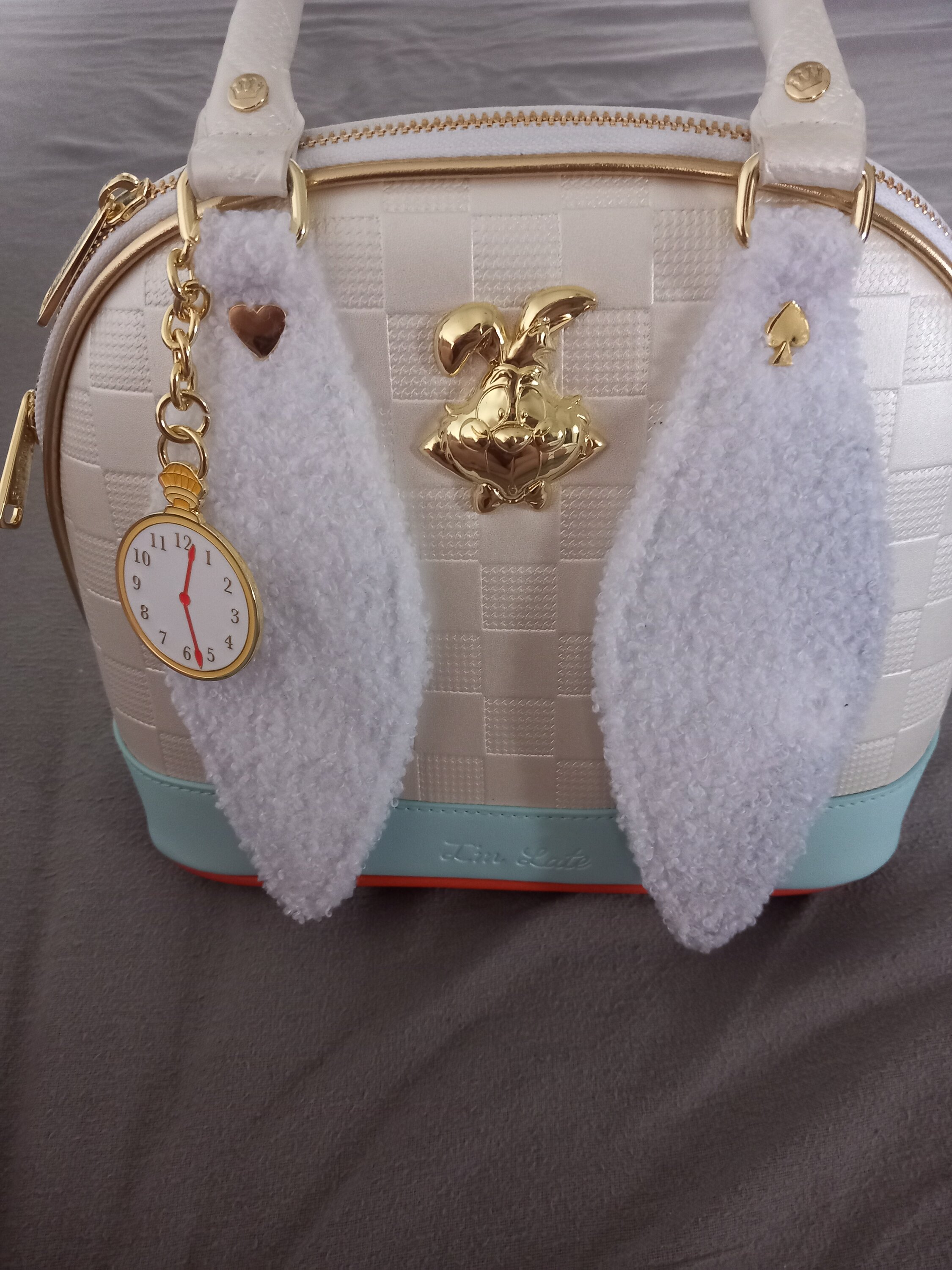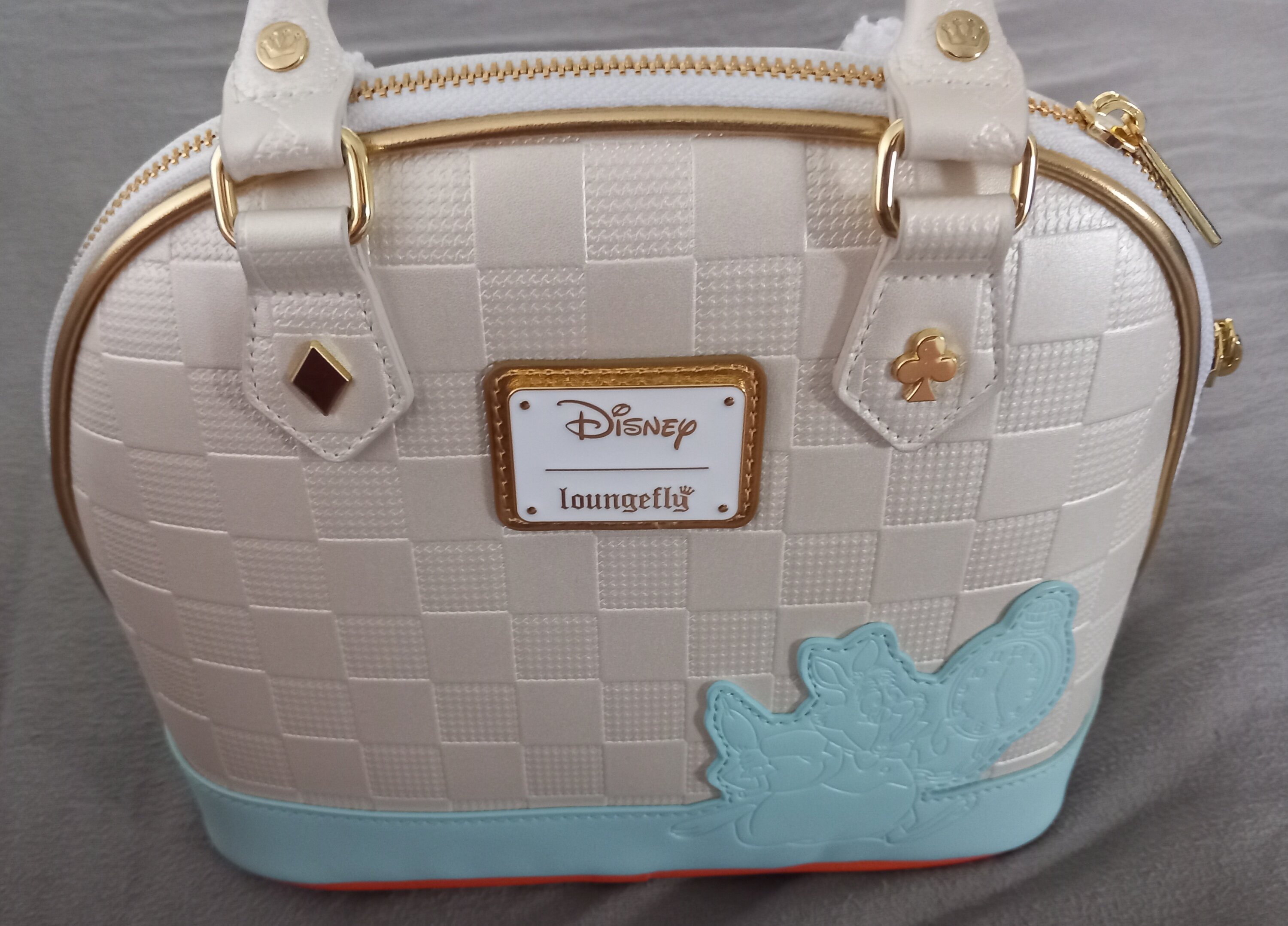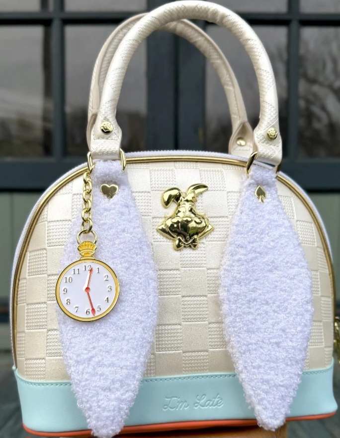 Este bolso de mano está inspirado en El Conejo Blanco de Alicia en el País de las Maravillas de Disney. Un estampado de cuadros blancos y grises lo cubre todo . Una franja azul en la base dice "Llego tarde". Un dije de metal moldeado en 3D del conejo está en un lateral y un aplique azul de él en la parte trasera con detalles en relieve. Dos apliques de sherpa se extienden desde el asa superior con forma de orejas de conejo. ¡También incluye un dije de reloj!
