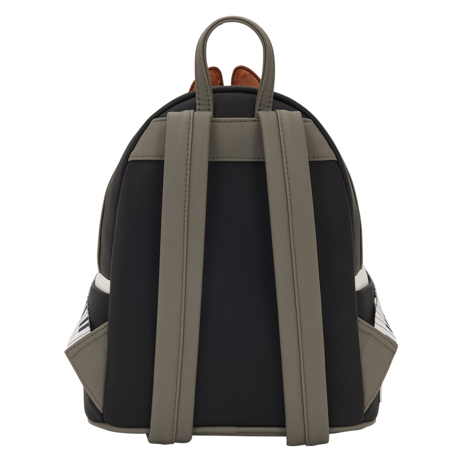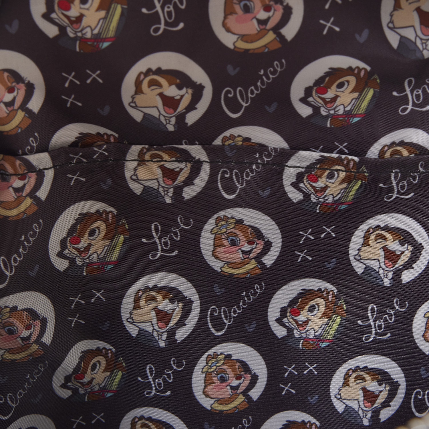 Encontrarás a Chip y Dale en la parte delantera de la mochila, apoyados uno encima del otro. Tienen detalles faciales bordados y un material de felpa. El resto de la mochila está inspirado en sus trajes. En el lateral, encontrarás una imagen de Clarice firmada por ella. Para un detalle extra adorable, ¡el tirador de la cremallera es un sombrero de copa!