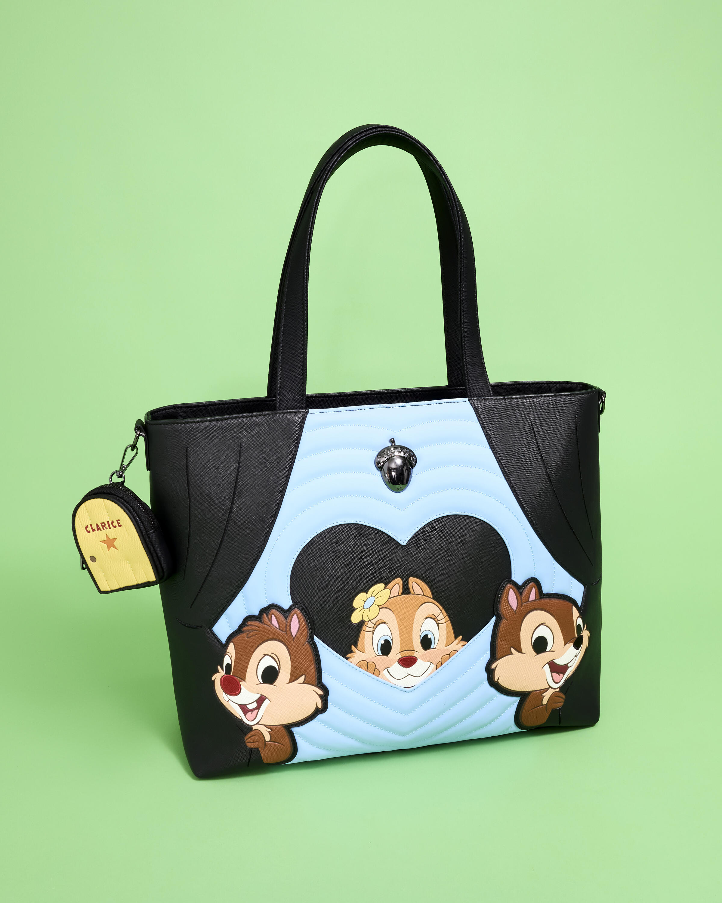 Este bolsa tote está inspirado en el cortometraje Chip y Dale. Encontrarás a Clarice en primer plano dentro de un marco azul en forma de corazón. Chip y Dale aparecen a cada lado de ella detrás de cortinas negras de teatro. Dale la vuelta al bolso para encontrar otra imagen de Clarice en la parte posterior. El material acolchado, los apliques acolchados, el poliuretano suave y los detalles bordados realmente hacen que este bolso destaque. En la correa cruzada, encontrarás un monedero con la forma de la puerta del camerino de Clarice.