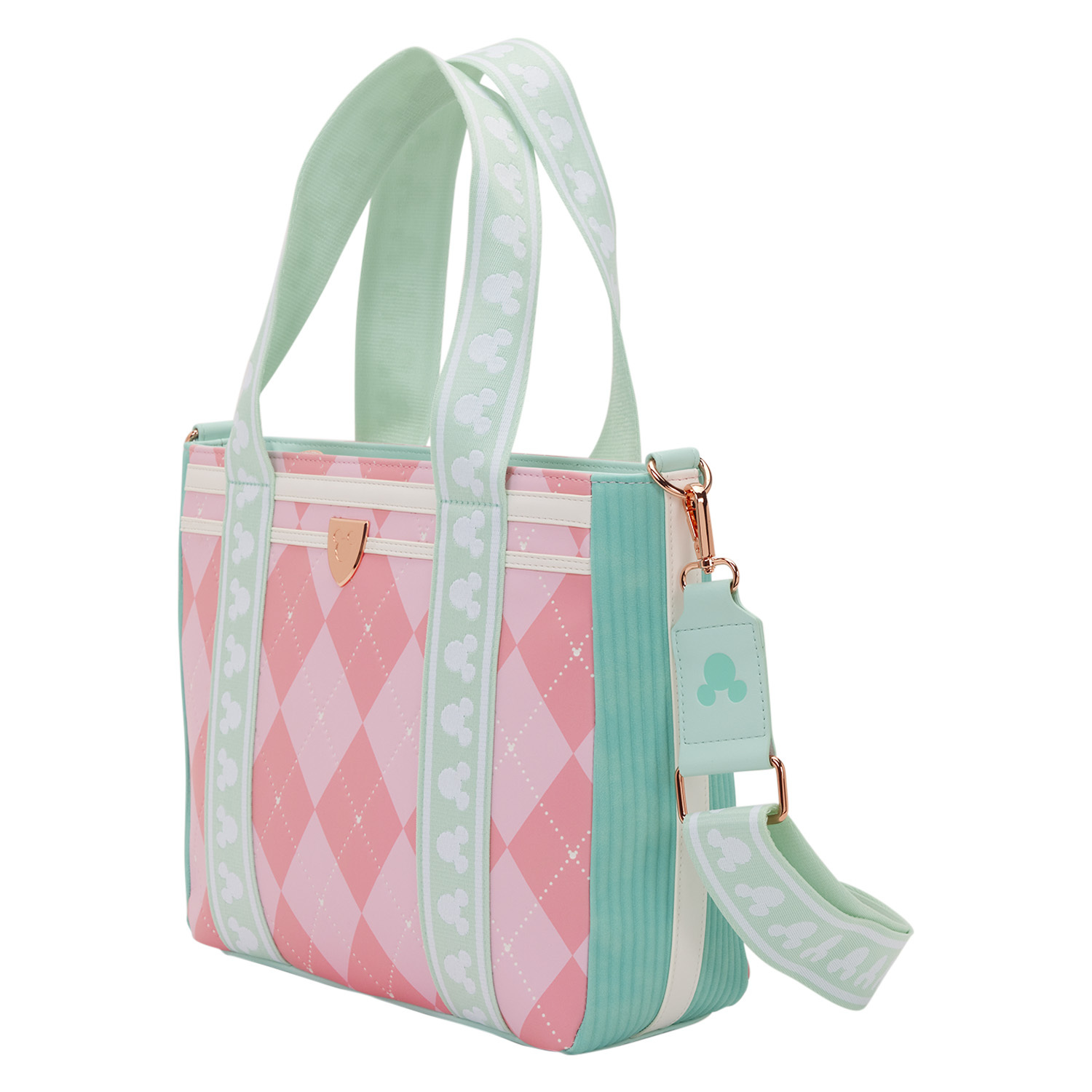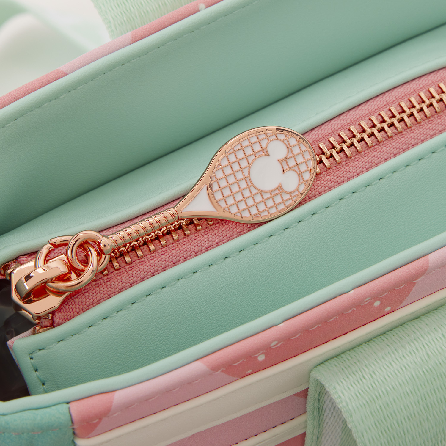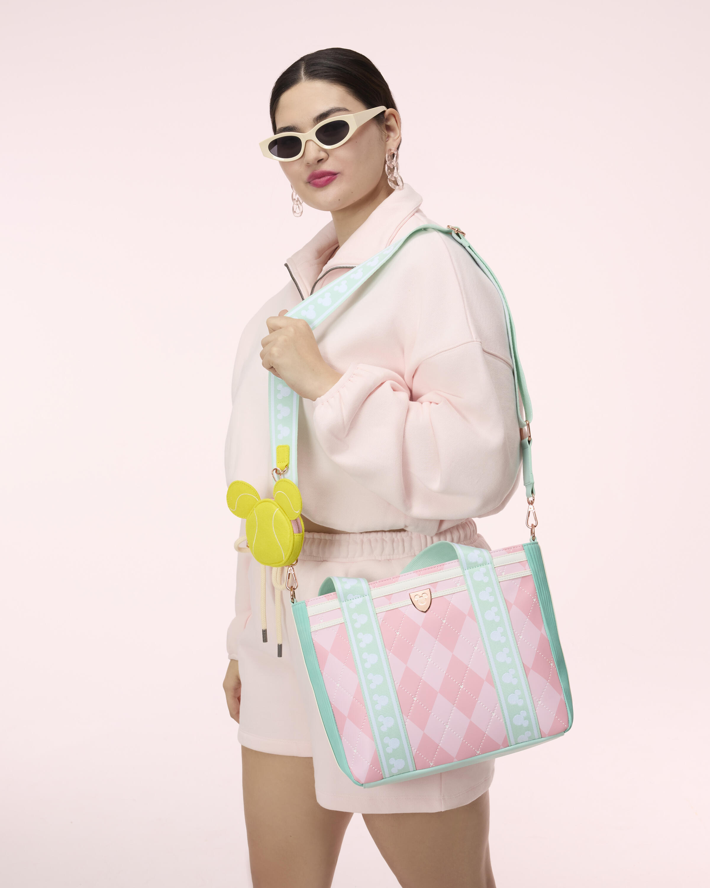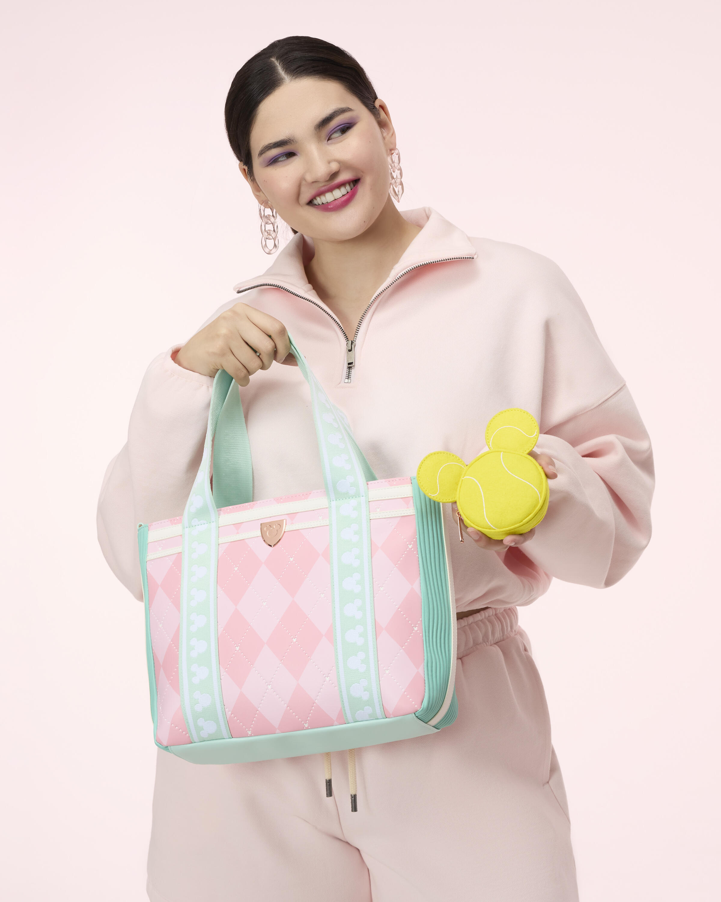 Este adorable bolsa tote combina el estilo Disney con la moda del tenis. Encontrarás un estampado de rombos rosa en este bolsa tote con un dije de metal moldeado en 3D con la silueta de Mickey Mouse en el centro. Las correas presentan un patrón repetitivo de siluetas de Mickey Mouse , ¡y el monedero parece una pelota de tenis con la forma de la silueta de Mickey!