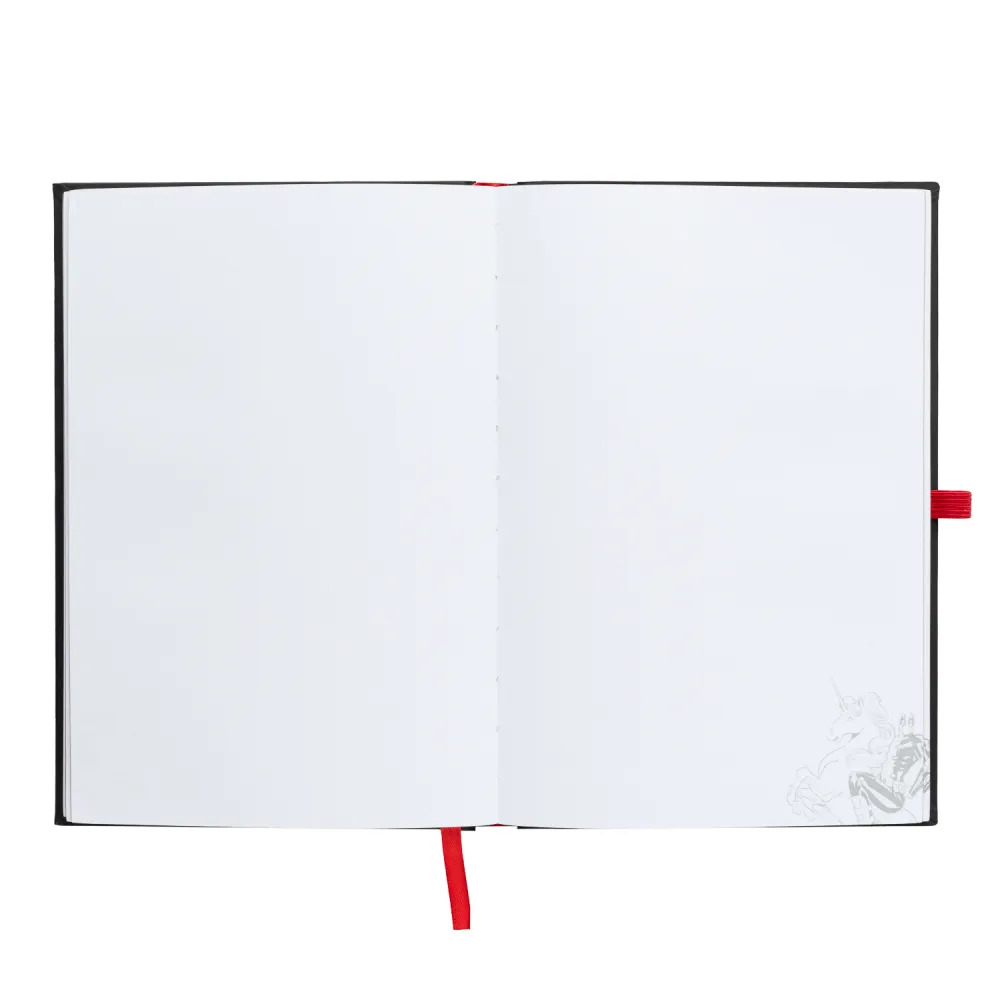 Libreta A5 (14,8 x 21 cm) con luz LED. Cuenta con una tapa dura de tacto suave, esquinas cuadradas, encuadernación encolada, interior personalizable tipo viñeta, marcapáginas de cinta, bolsillo interior y portalápices elástico. Contiene 96 hojas (192 páginas) de papel de 100 g/m². La tapa se ilumina al presionar un botón en la parte inferior central. Funciona con tres pilas LR1130 de 1,5 V (incluidas).